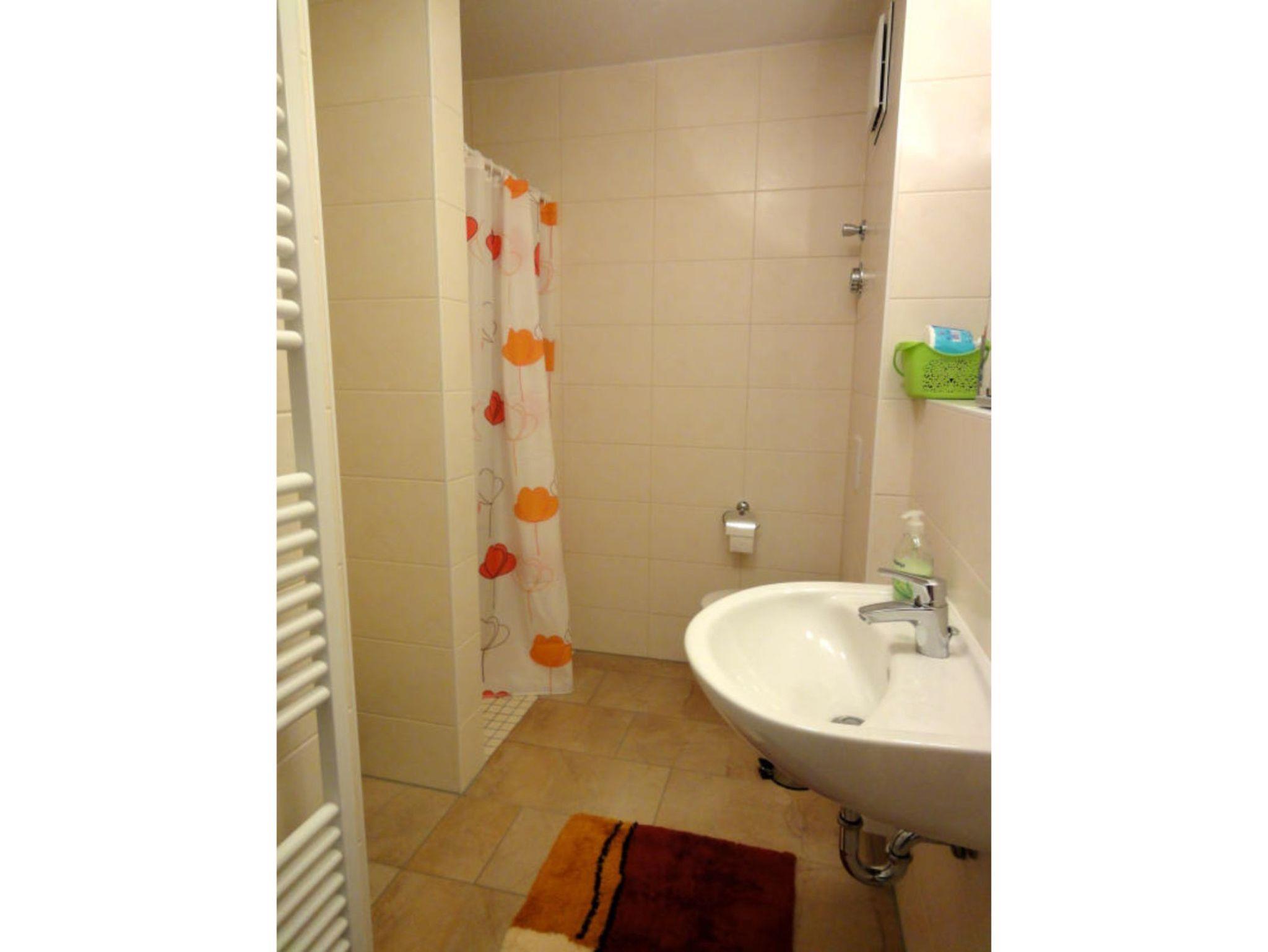 Das Bad hat eine bodengleiche Dusche und ein WC.
