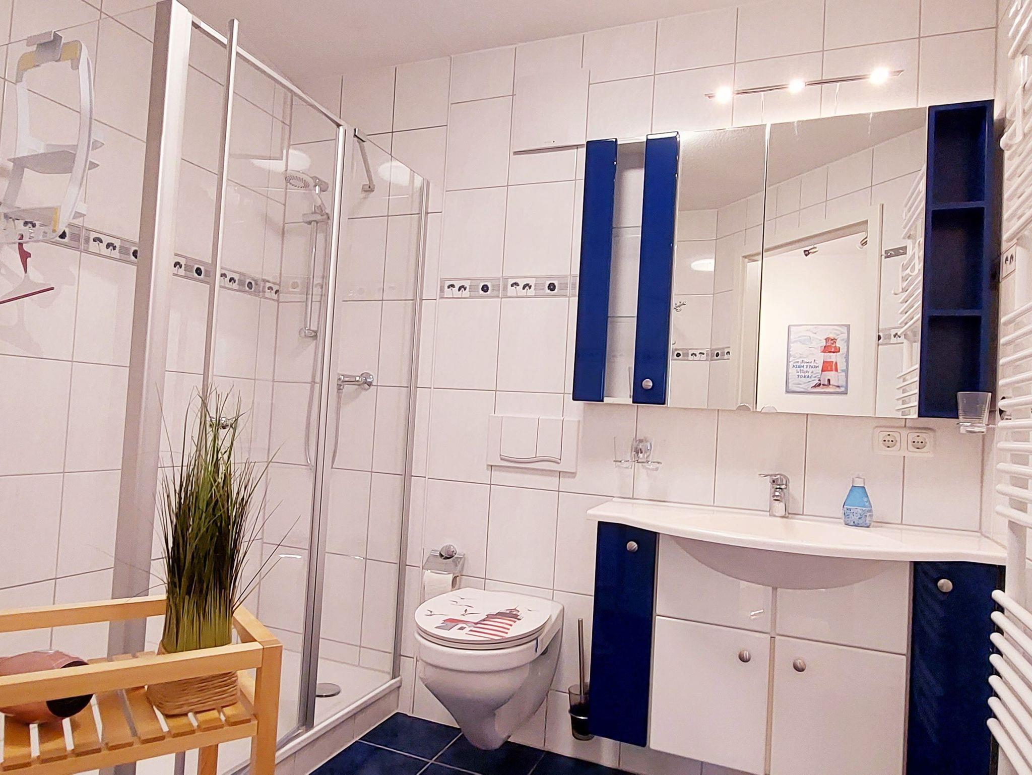 • Bad: Geräumige Dusche, Bad- und Spiegelschrank, Ablagemöglichkeiten und Hocker, Fußbodenheizung im Bad und beheizbarer Handtuchtrockner, Fön