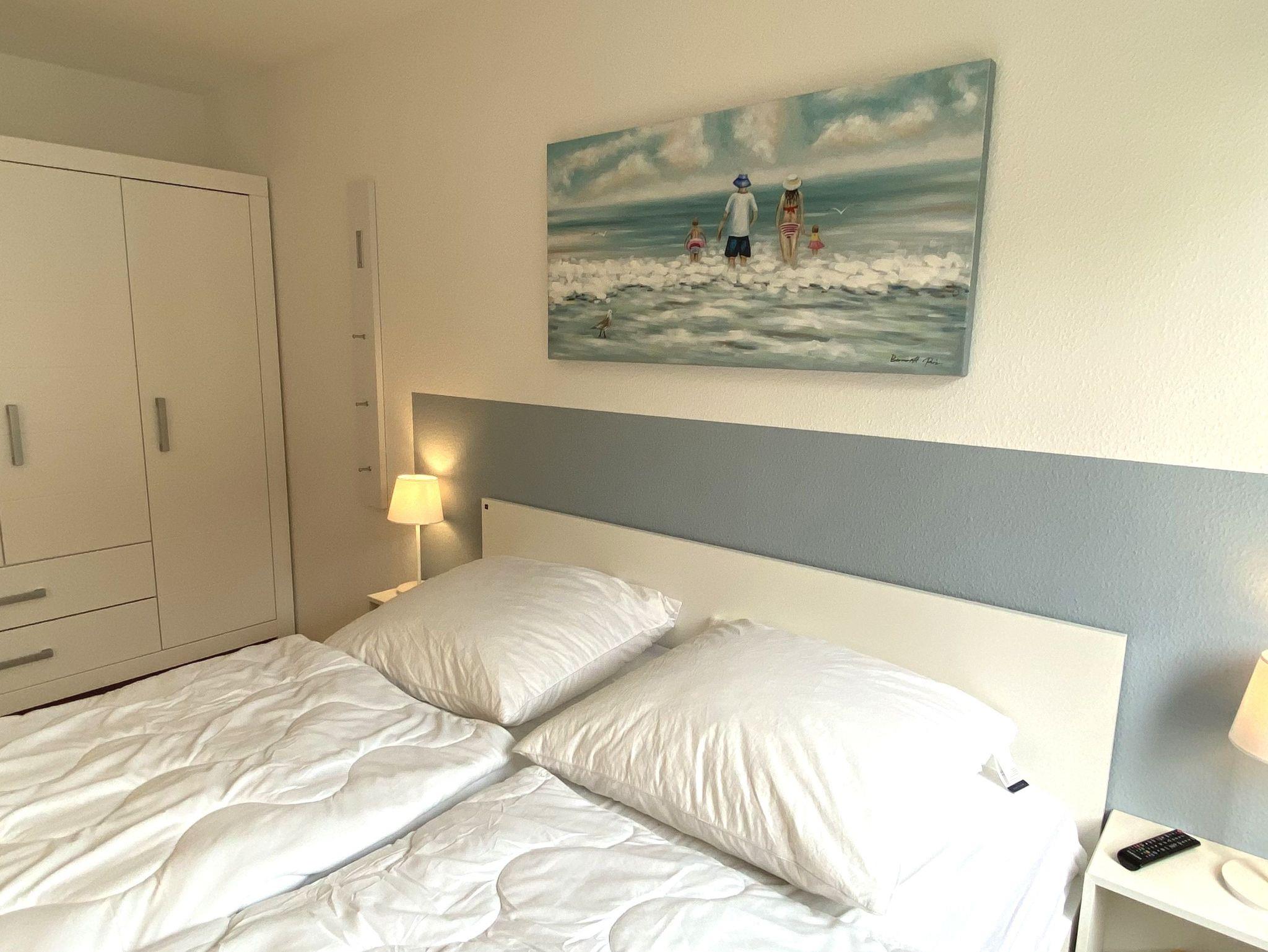 • Schlafzimmer I: Doppelbett 1,80 x 2,00, Wäscheschrank, Spiegel, Ablagen neben Bett mit Nachtischlampen, Flachbild-TV (30 Zoll), Strandlektüre, Faltrollo-Plissees und Vorhang zum Verdunkeln