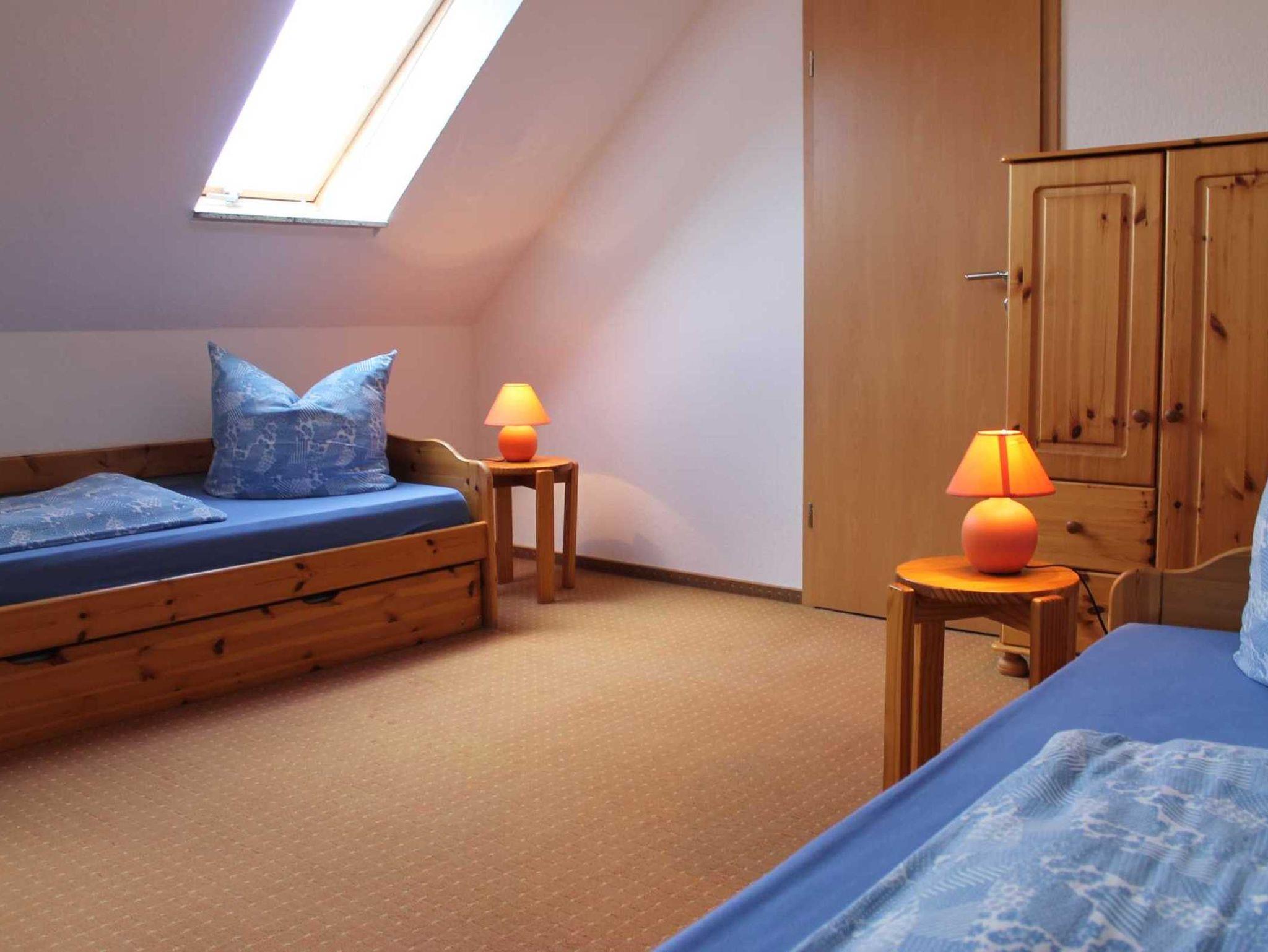 Eine Treppe führt ins Dachgeschoss. Dort 1 offener Schlafraum (3 Einzelbetten)