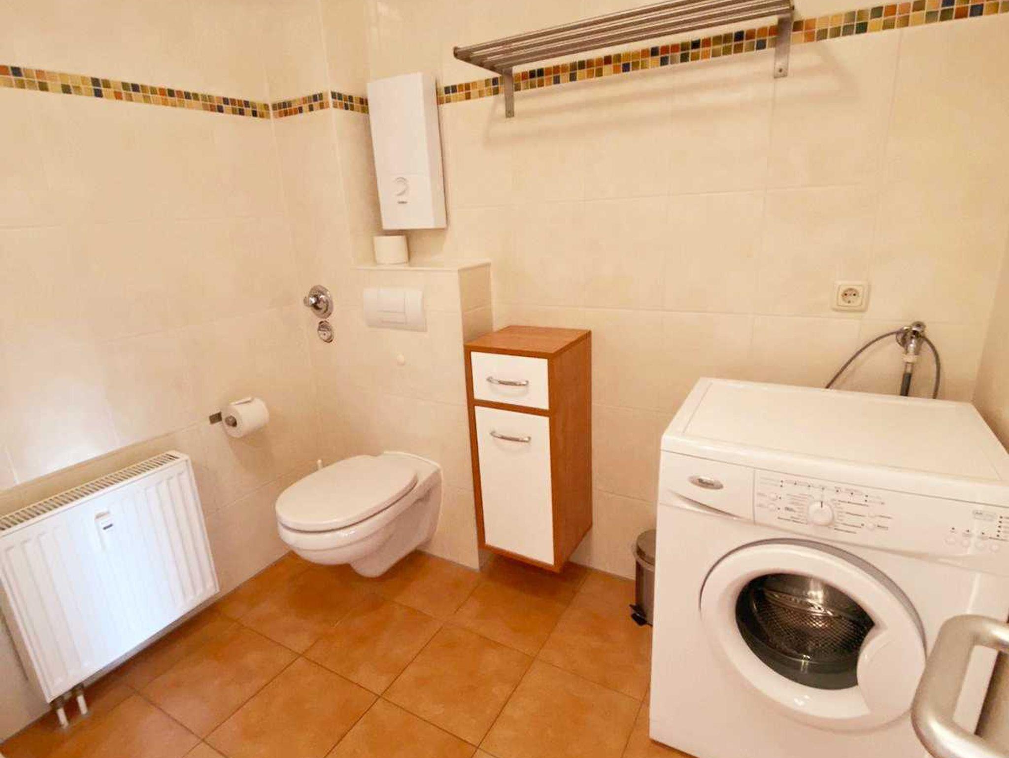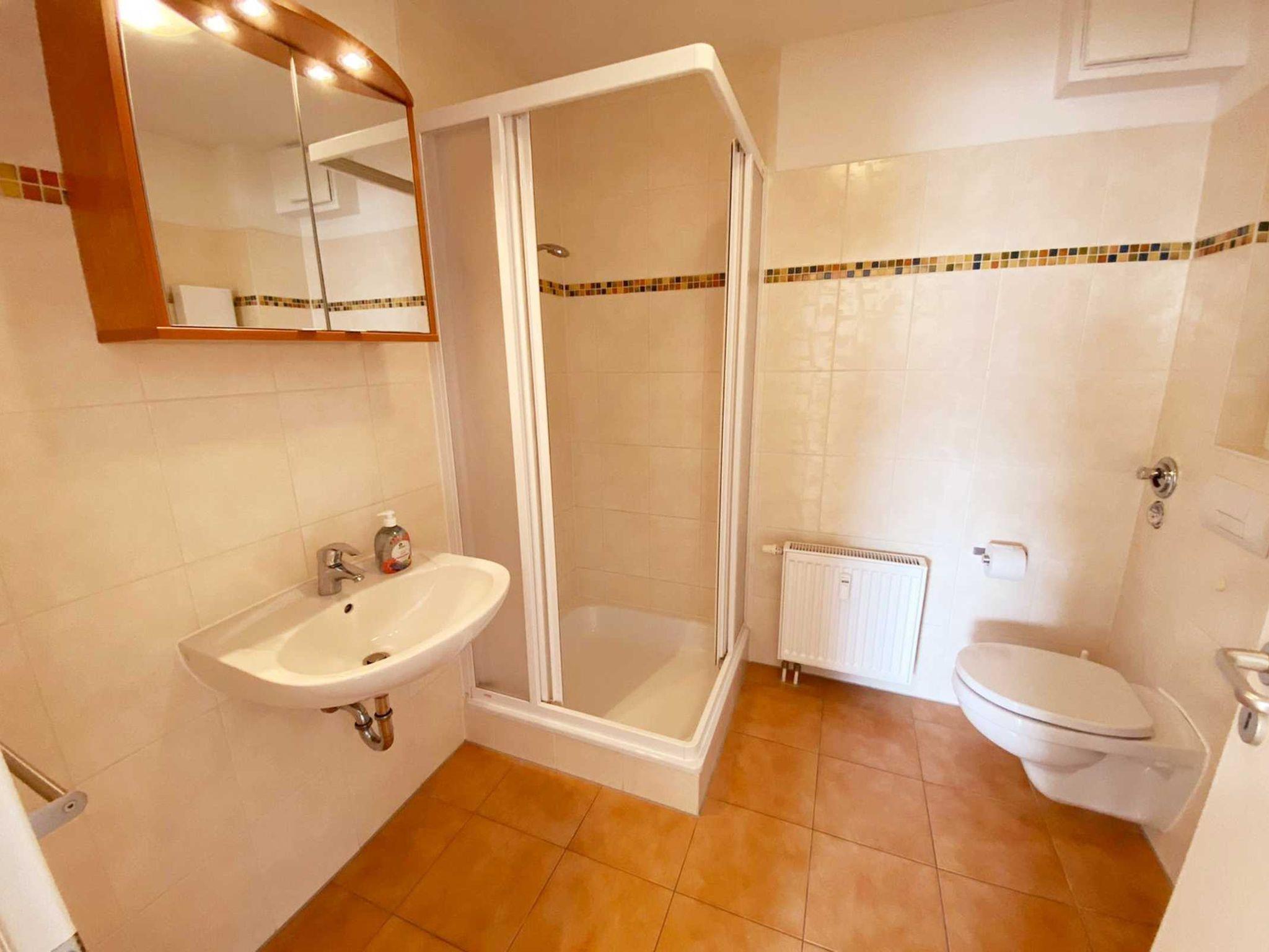 • Bad: ohne Fenster, Dusche, Waschbecken, Toilette, Spiegelschrank, Waschmaschine Frontlader, Handtuchhalter