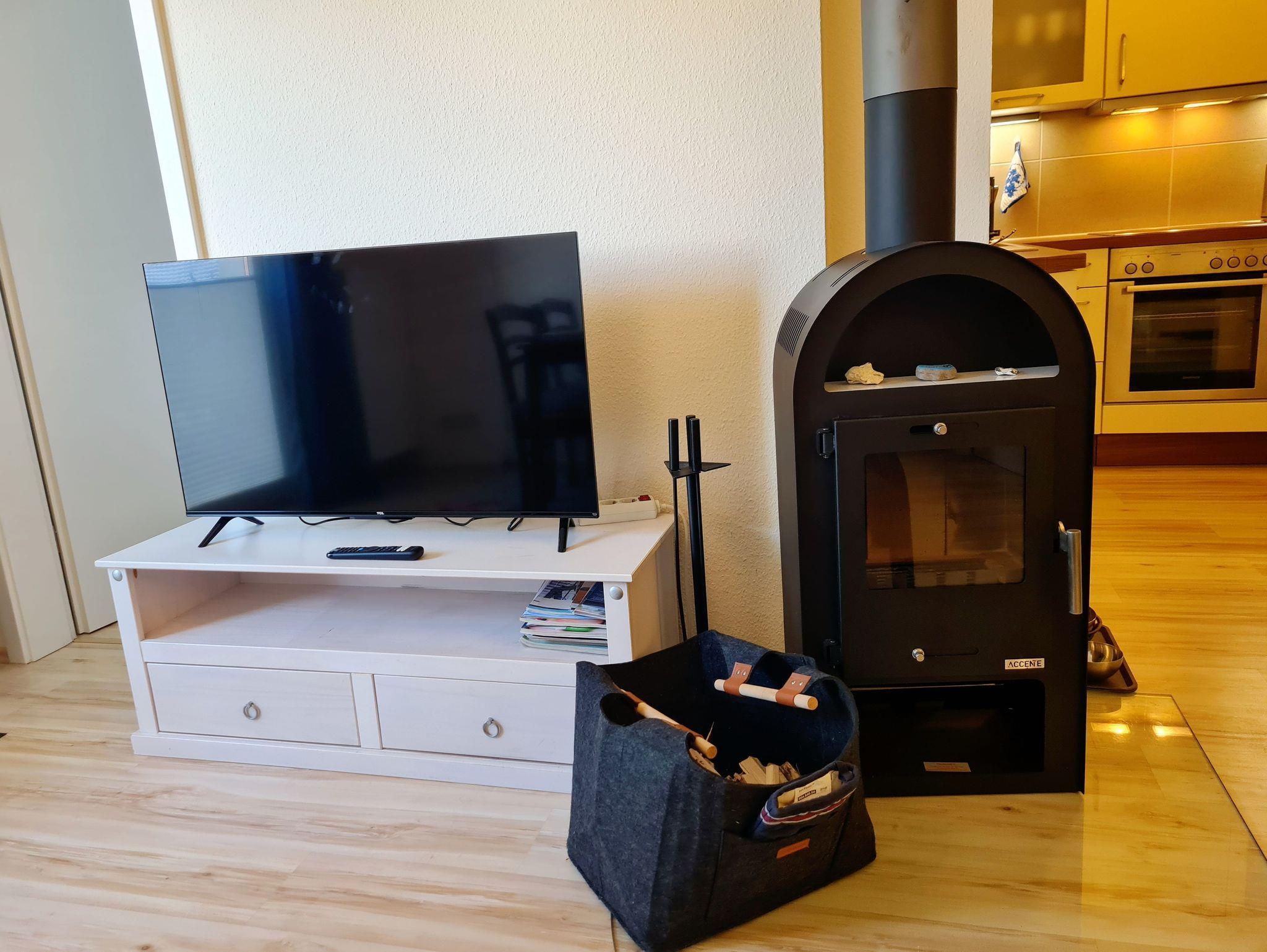 • Wohnzimmer: gemütliche Schlafcouch mit 130x200 cm, Flachbild-TV, TV-Bank, Tisch, direkter Zugang zum Westbalkon, Kaminofen, Plissees und Verdunklungsvorhänge