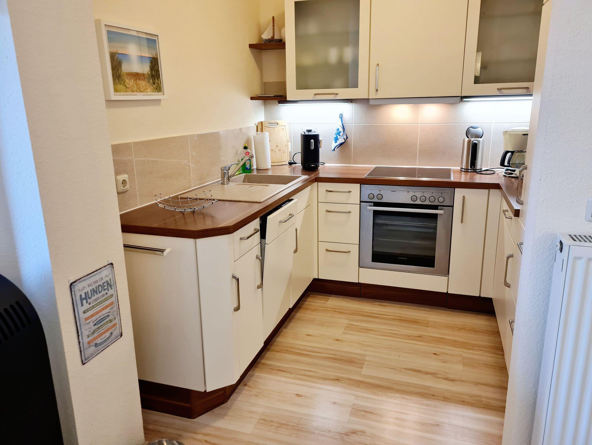 • Küche und Essbereich für 4 Personen offen zum Wohnzimmer mit Backofen, Ceranfeld, Geschirrspüler, Toaster, Kaffeemaschine, Wasserkocher, Kühlschrank mit Gefrierfach, Mikrowelle