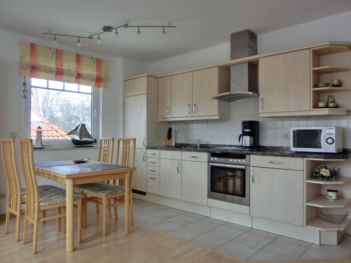 • Offene Küche mit Geschirrspülmaschine, Herd mit Backofen, Kühlschrank mit Gefrierfach, Kaffeemaschine, Toaster, Wasserkocher, Mikrowelle