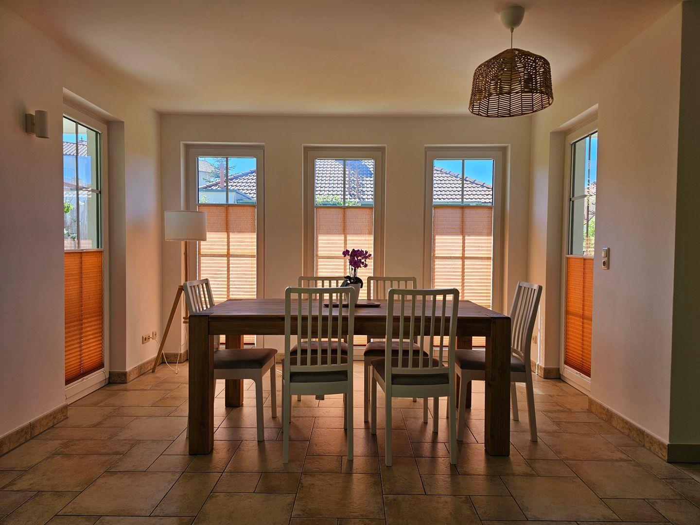 - das Haus hat etwa 145 qm Wohnfläche, verfügt über ein helles und geräumiges Wohnzimmer inkl. großes TV-Gerät und gemütlichen Sitzbereich mit angrenzender Wohn-Küche, getrennt durch eine Schiebetüranlage