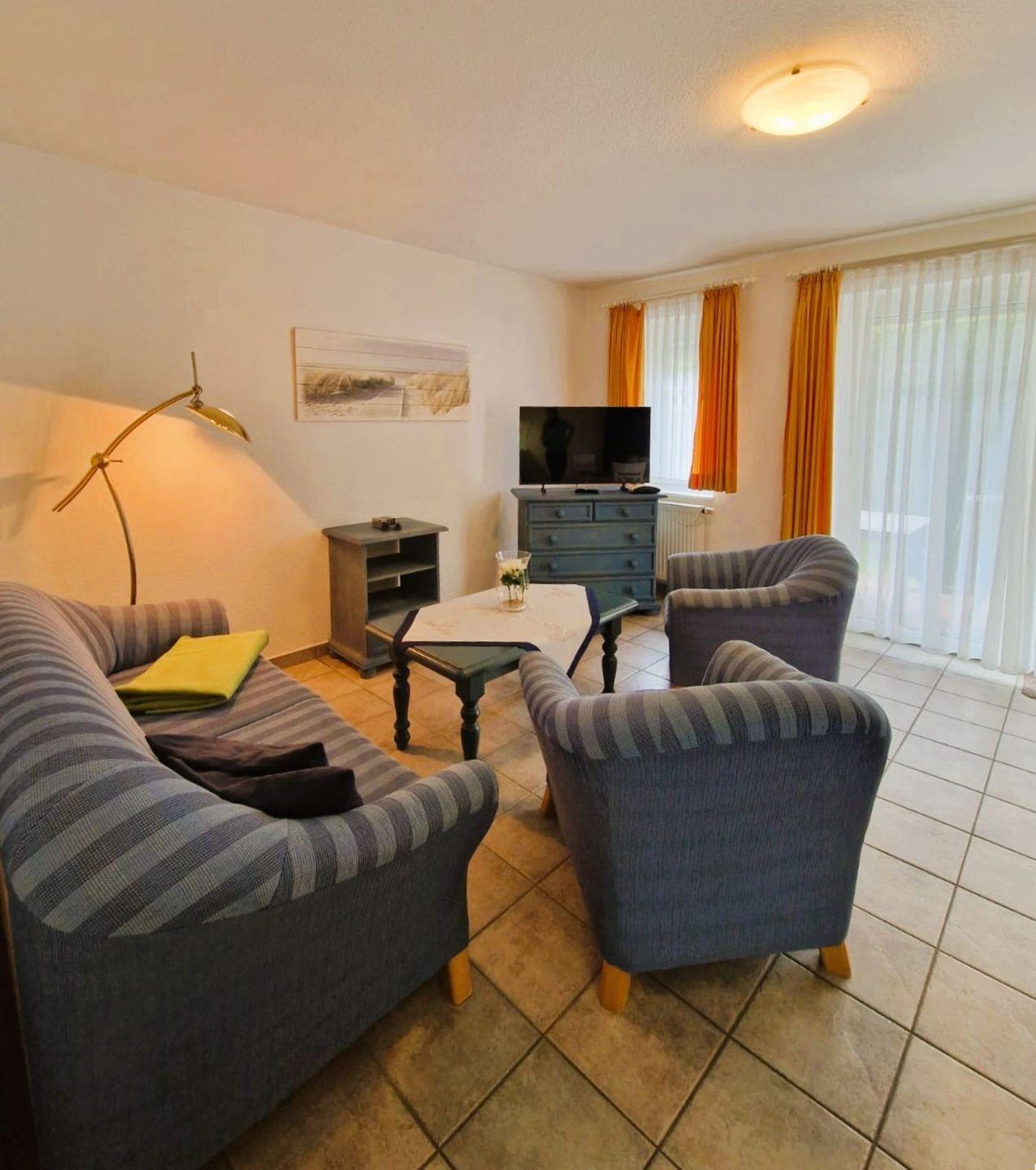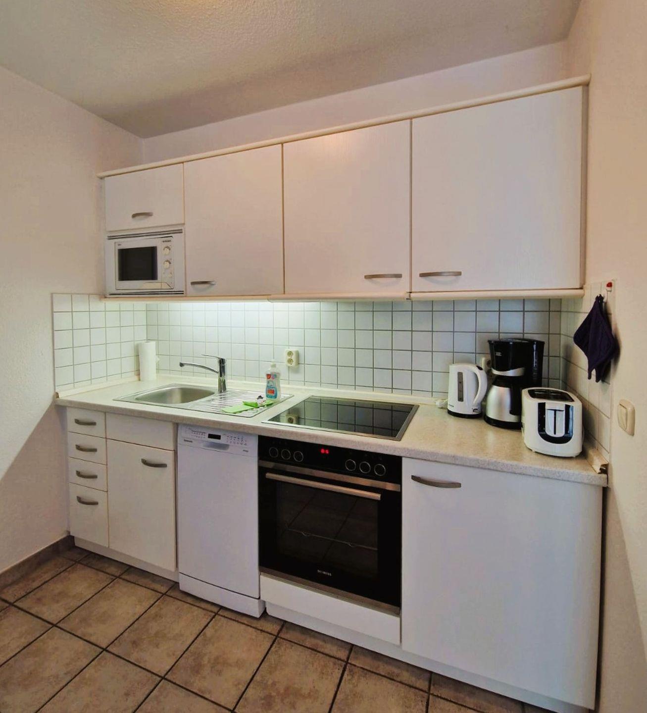 Wohnzimmer befindet sich eine Couch mit Schlaffunktion für die 3. und 4. Person, die offene Küchenzeile ist komplett ausgestattet mit (Spühlmaschine, Mikrowelle und E-Herd ohne Backofen.), Im Schlafzimmer befindet sich ein Doppelbett (1,80m x 2,00 m), bodentiefe Fenster mit Aussenjalousie im Wohnzimmer und Schlafzimmer lassen viel Licht in die Wohnung. Im innenliegenes Bad befinden sich Dusche/WC.