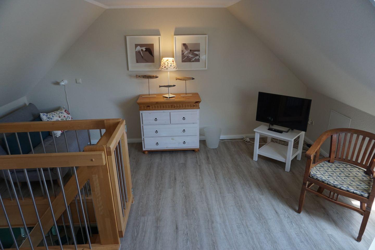 Bad mit Dusche/WC, Waschmaschine mit Trockner, offenes Schlafzimmer im Obergeschoss mit Doppelbett und Schlafsofa (1,40) und Sat-TV, WLAN vorhanden!