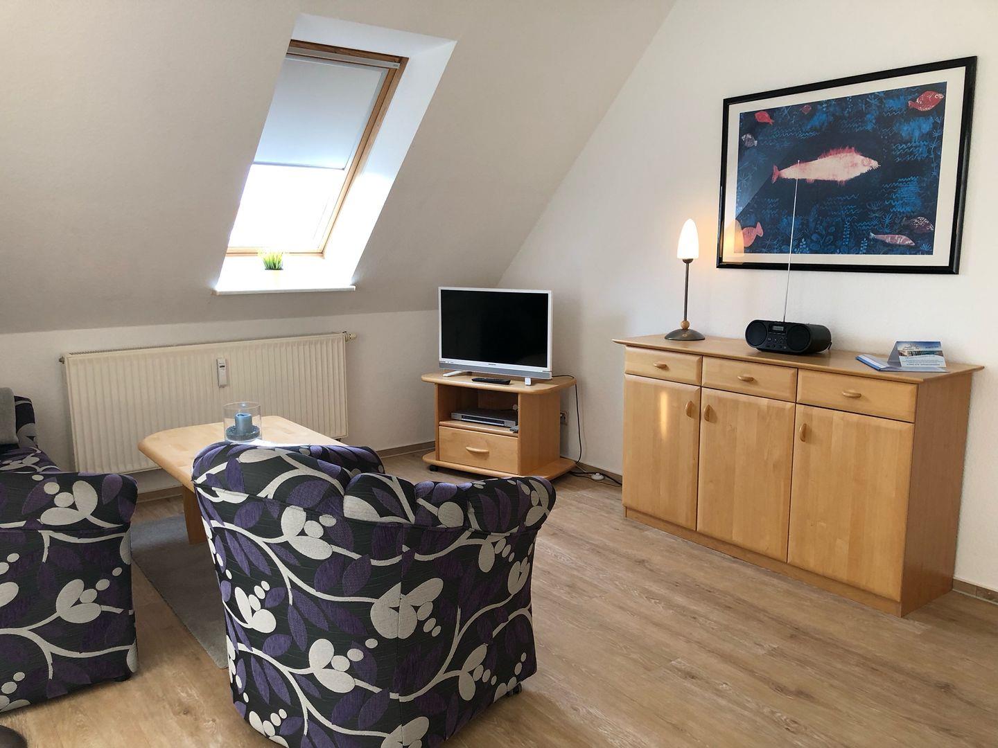 der offene Wohnbereich ist mit einer Schlafcouch und einem Sat-TV ausgestattet. Der Balkon ist auf der Südseite. Die Küchenzeile ist mit allem ausgestattet, was man braucht (z.B. Spülmaschine), im Schlafzimmer steht ein Ehebett, Im Badgibt es eine Badewanne/WC.