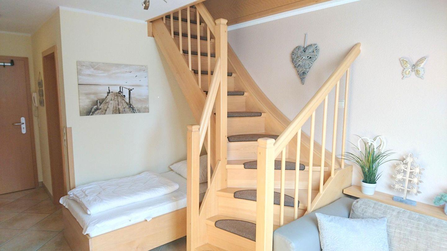 gemütliches 1-Raumappartement mit einem Einzelbett und einem Wandbett im neugeb. Doppelhaus,1.Stock,ca.38qm, Strand 800m, 1 Pkw-Stell- Platz, zentrale ruhige Lage, Grillplatz mit Terrasse und Gartenmöbel mit gem. Gartennutzung, überdachter Fahrradständer, Dusche/WC,TV/Hifi, komplett ausgestattete separate Küche mit Geschirrspüler/Ceran/Backofen/Kühlschrank mit Gefrierfach