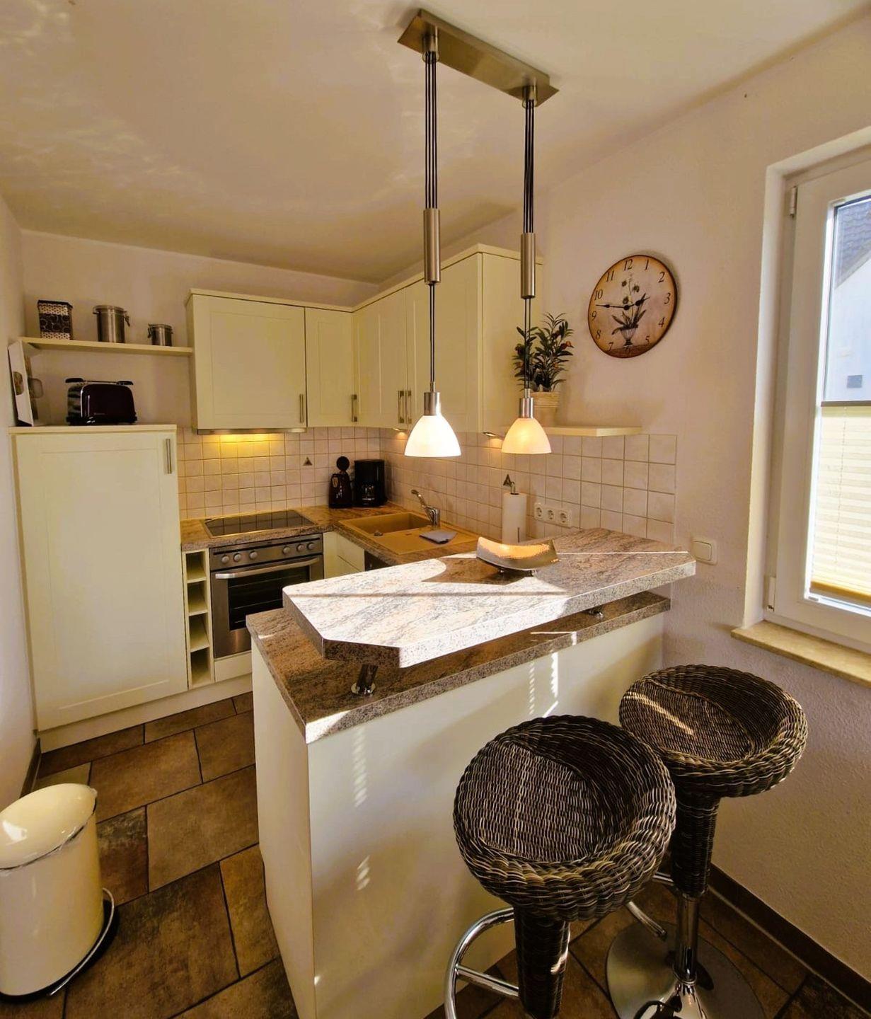 Das Haus verfügt im Erdgeschoß über eine offene, komplett eingerichtete Küche (Herd mit Cerankochfeld, Backofen, Geschirrspüler und Kühlschrank mit Gefrierfach),