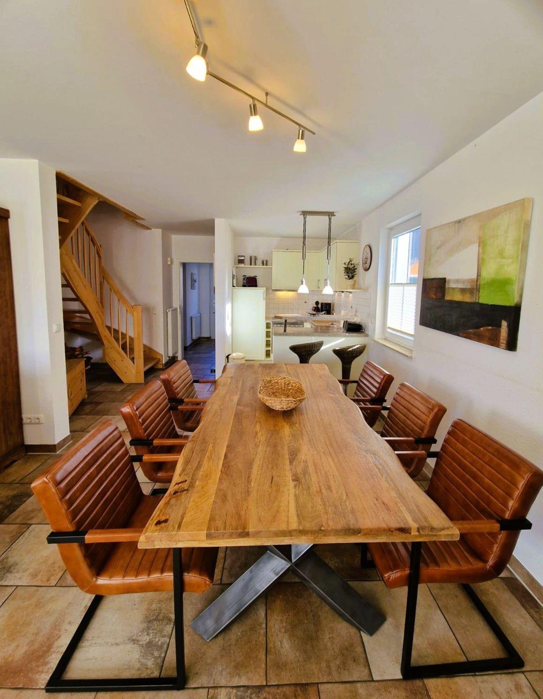 Der zur Küche offene Wohn-Essbereich ist mit TV und großem Esstisch ausgestattet. Ein behaglicher Kamin ergänzt das ruhige Ambiente.