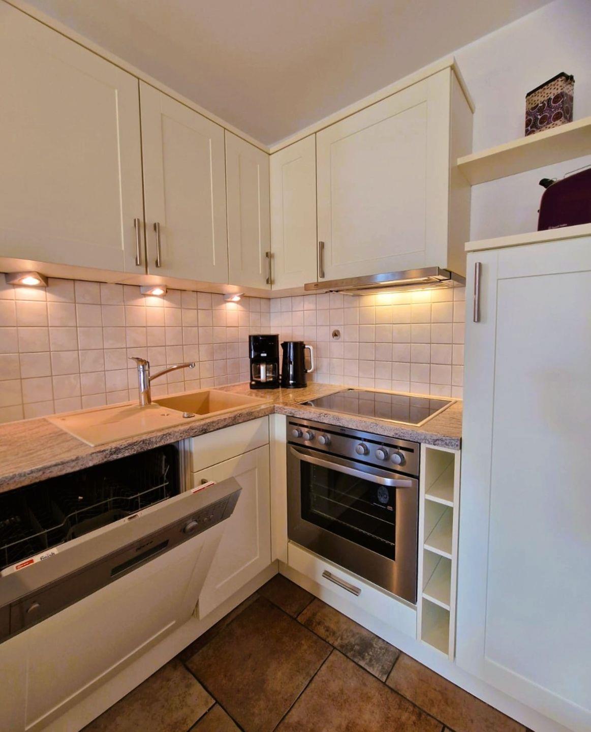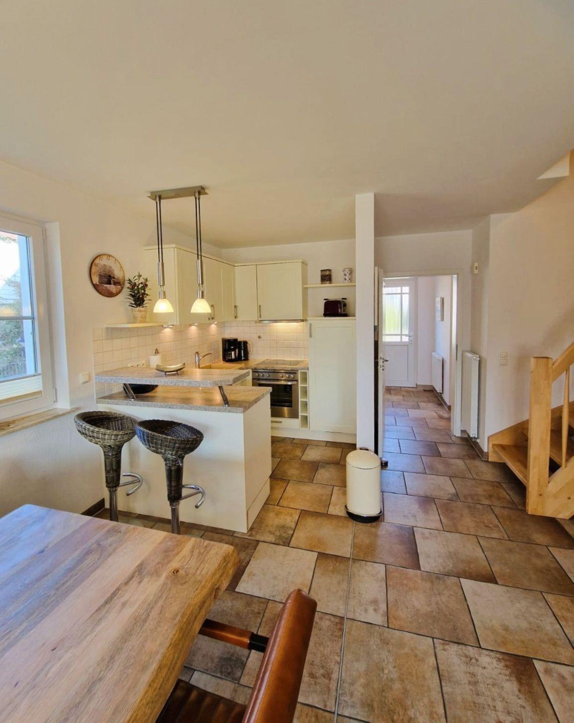 Das Haus verfügt im Erdgeschoß über eine offene, komplett eingerichtete Küche (Herd mit Cerankochfeld, Backofen, Geschirrspüler und Kühlschrank mit Gefrierfach),