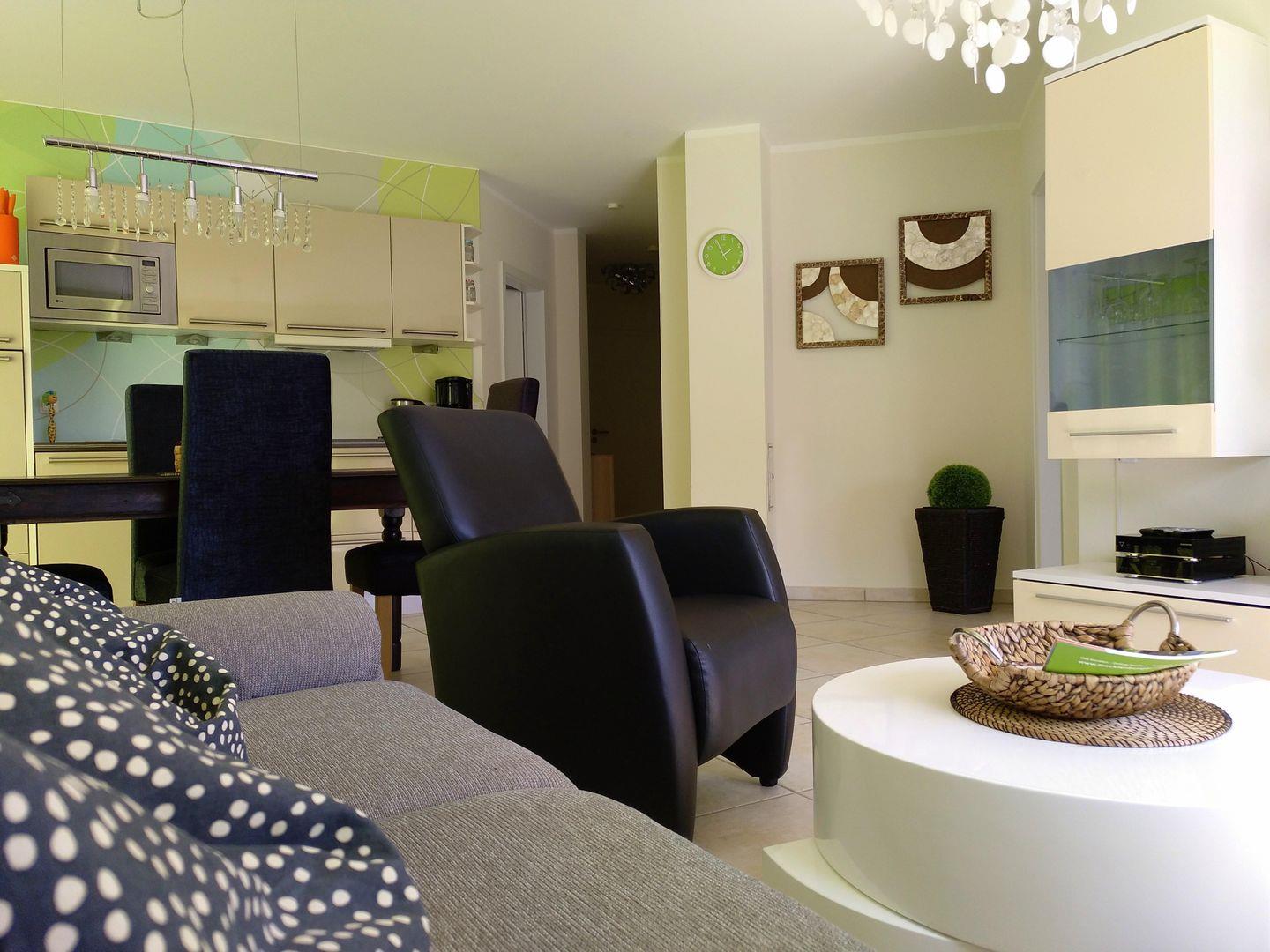 Zur Ferienwohnung gehört: Der einladende Wohnbereich mit geselligem Essplatz und einer funktional eingerichteten Küchenzeile, ein kuschliges Schlafzimmer, ein weiteres Schlaf-/Kinderzimmer sowie ein raffiniert gestaltetes Badezimmer.