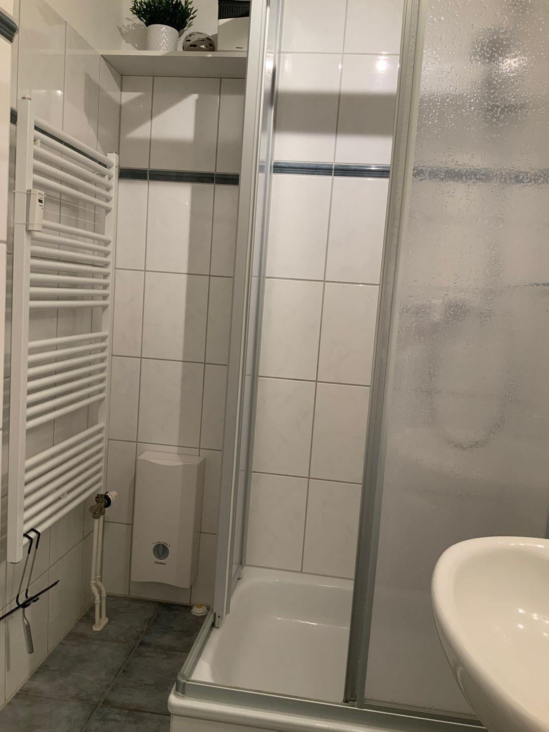 Schlafzimmer mit Doppelbett, Badezimmer mit Dusche, WC und Waschmaschine