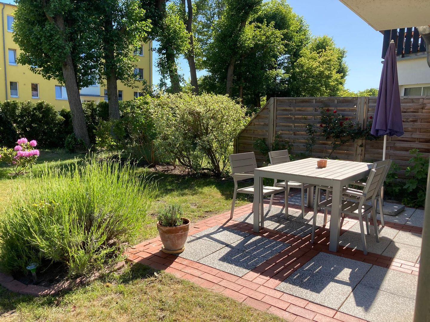 Moderne 2-Zimmer-Ferienwohnung mit großer Terrasse und Garten in Zingst, nahe Ostsee und Bodden, ideal für bis zu 3 Personen.
