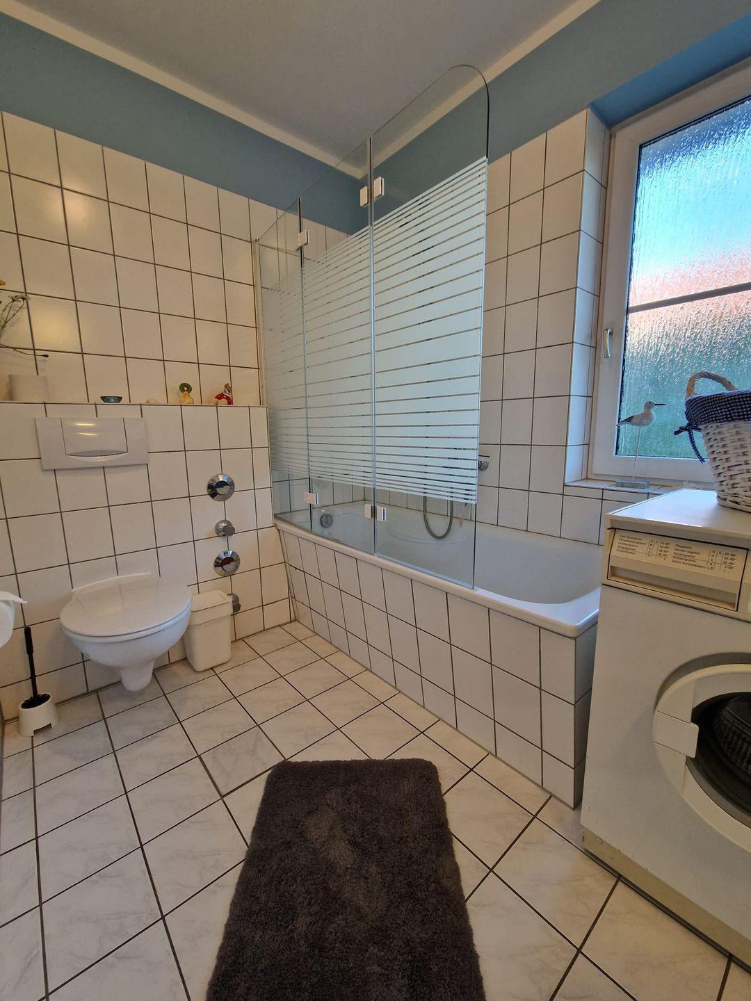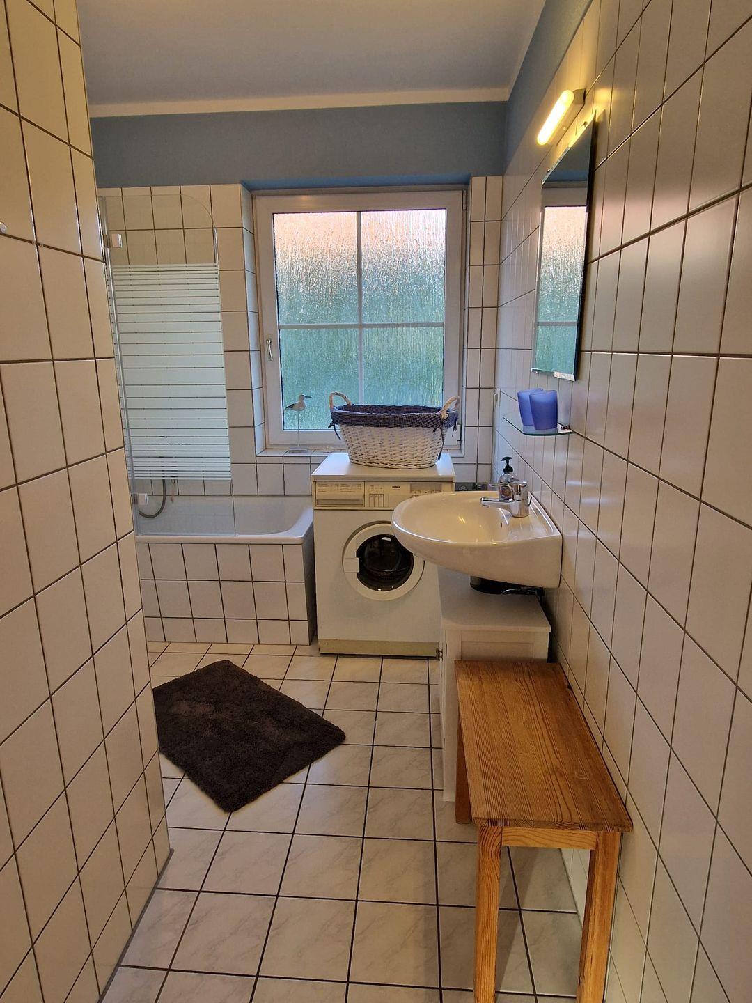 Die Badezimmerausstattung lässt keine Wünsche offen. Sie finden sowohl eine Dusche als auch eine Badewanne, die zur Entspannung einlädt. Zusätzlichen Komfort bieten die Waschmaschine und die Heizung in der Unterkunft.