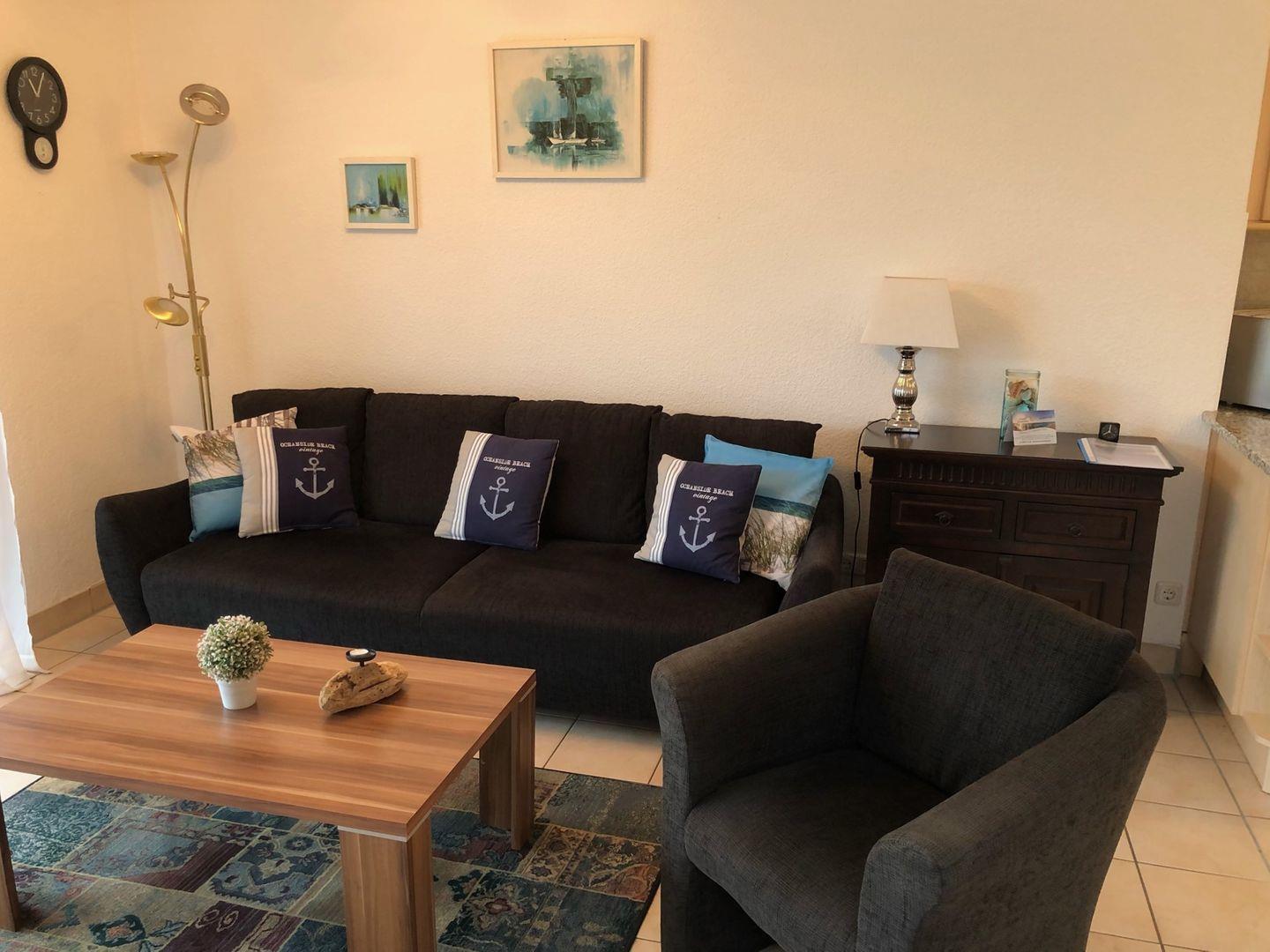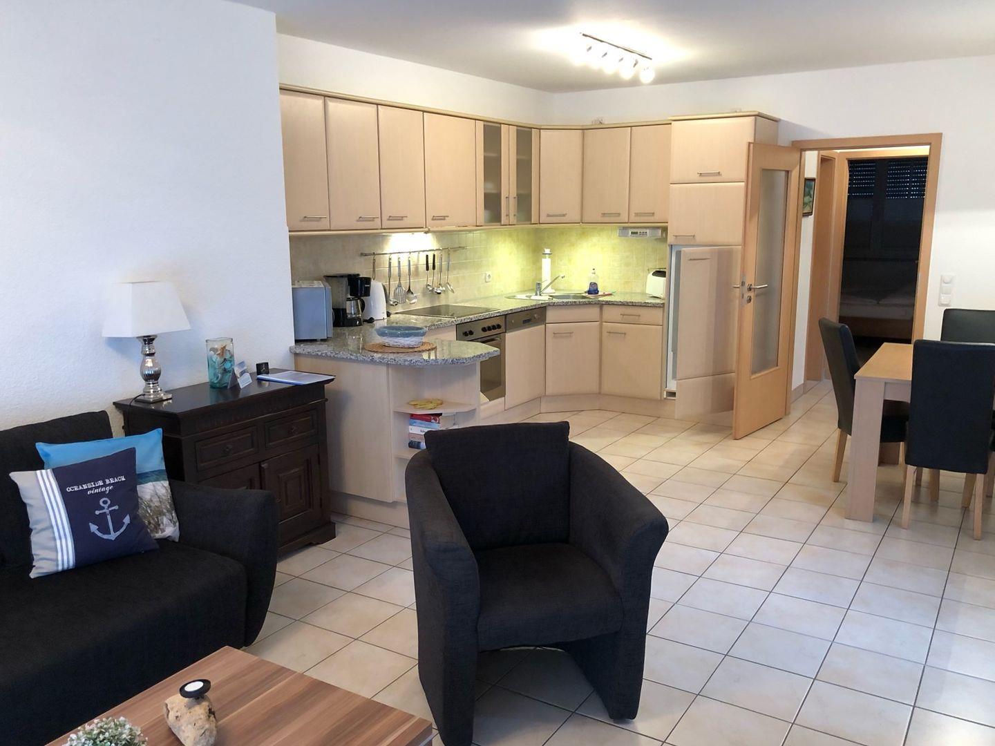 Moderene Ferienwohnung für 2 Personen, ca.56qm, Strandentfernung 5 Gehminuten, Wohnzimmer mit kompletter Küchenzeile, Geschirrspüler, Kühlschrank mit Gefrierkombination, Dusche/WC, Schlafzimmer mit Ehebetten, Terrasse mit Campingmöbel, PKW-Stellplatz Nr. 3