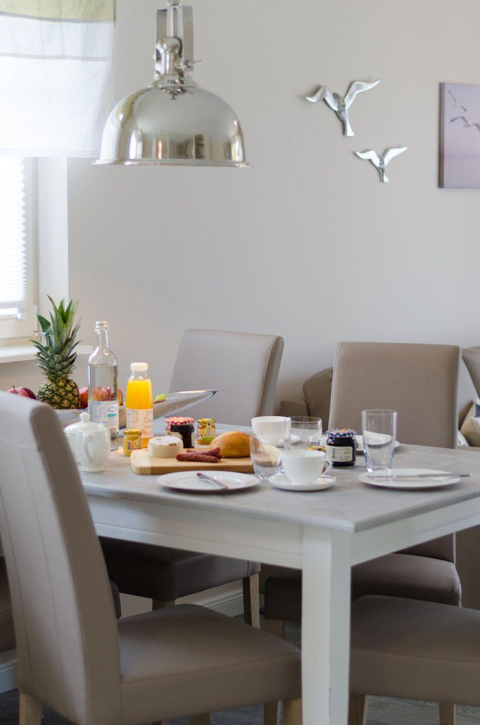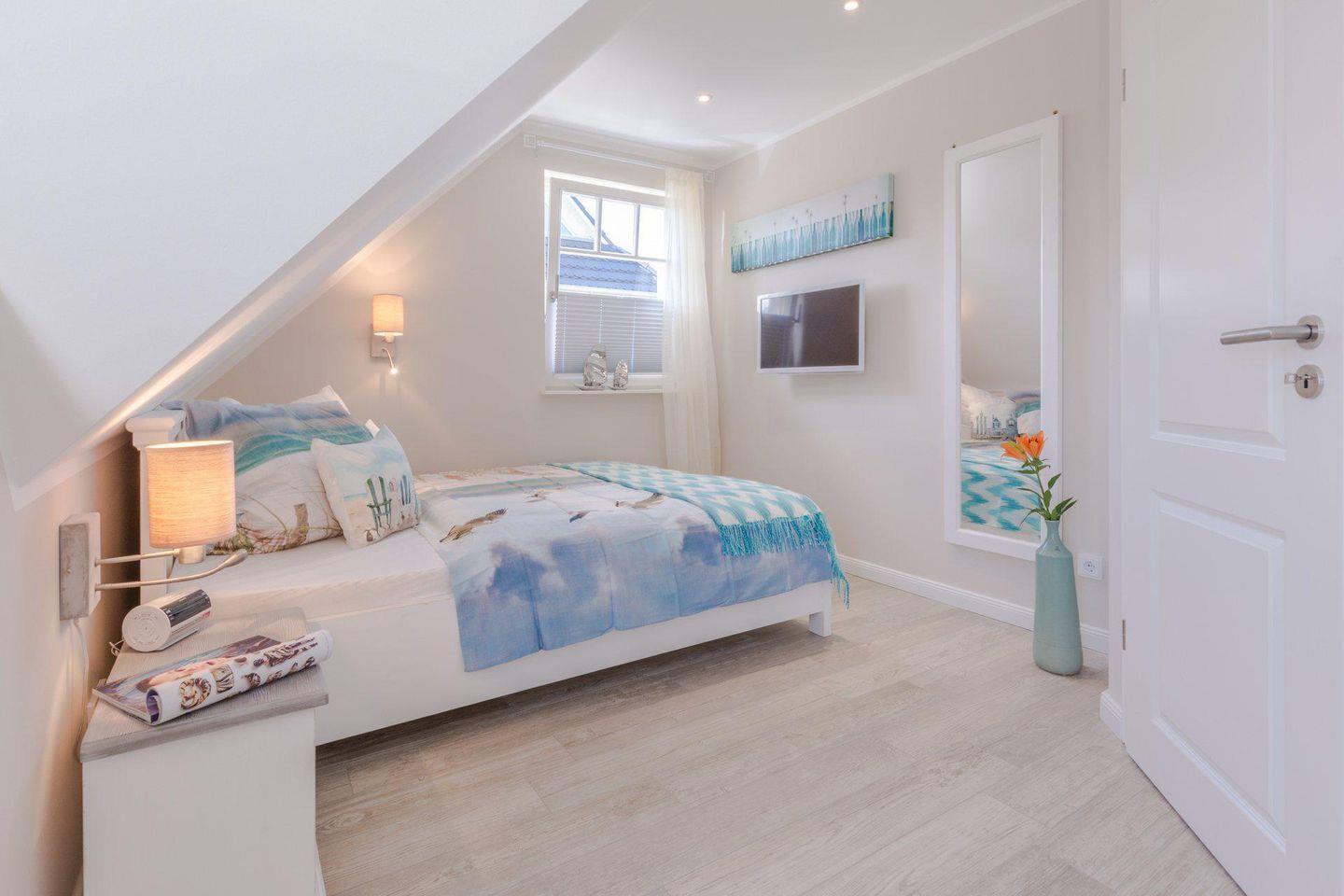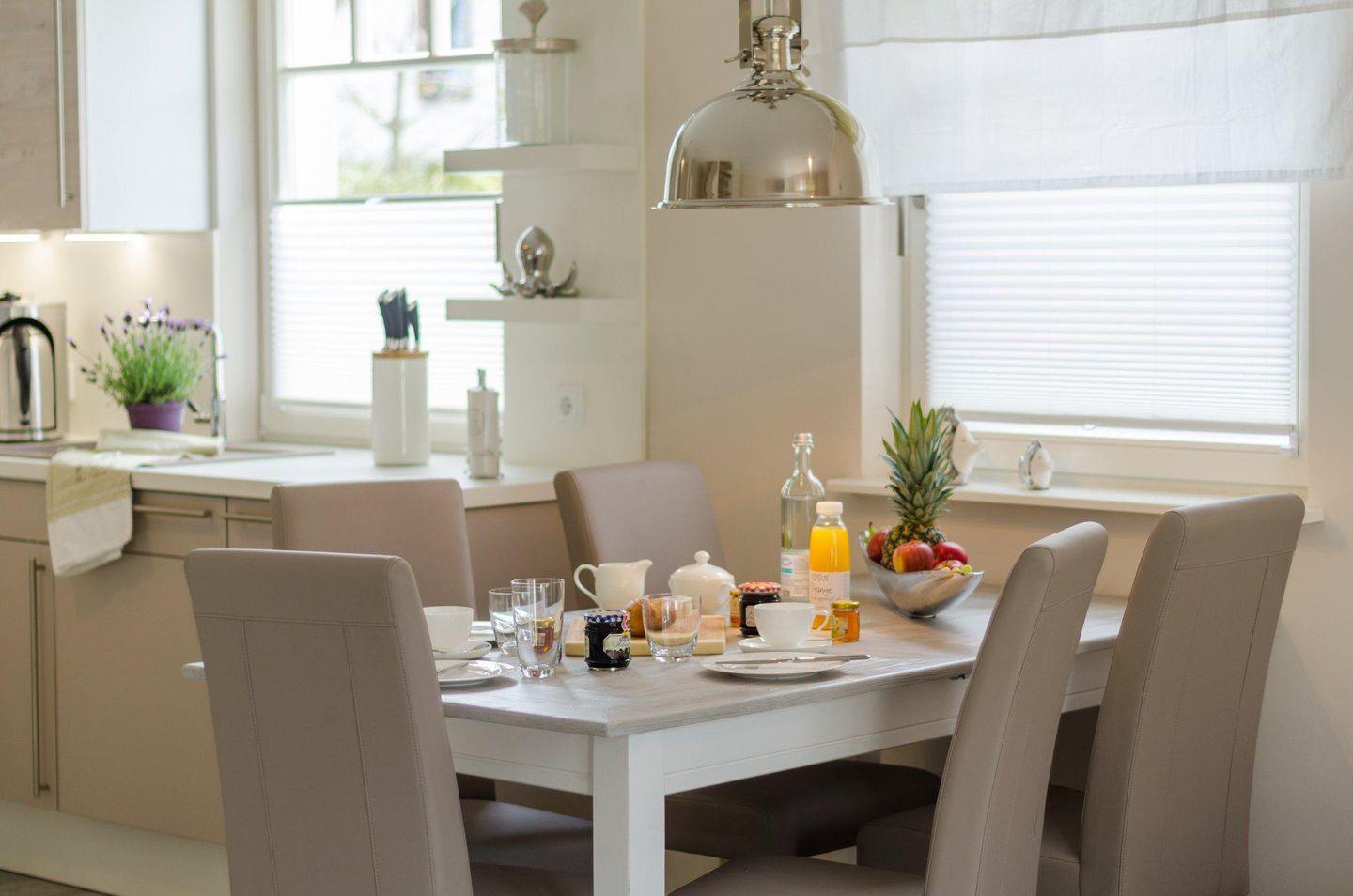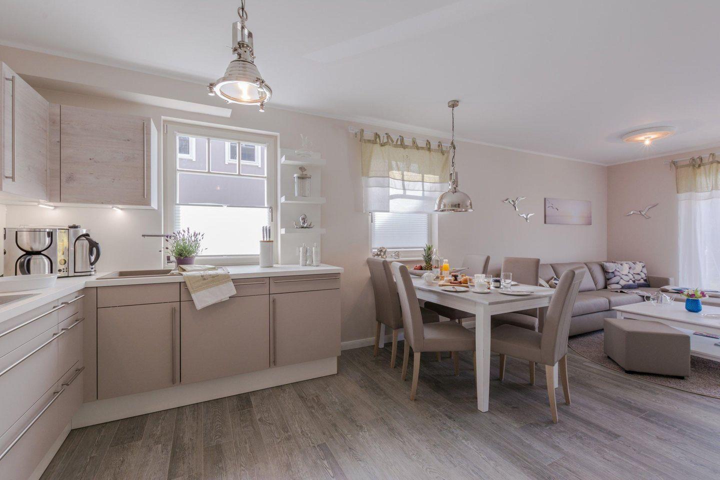 Ein großzügiger Wohnraum mit Essbereich verfügt über LED-TV, Blue-Ray-HiFi-Anlage und Kaminofen sowie eine komplett ausgestattete Einbauküche. Kostenfreies WLAN. Alle drei Schlafzimmer verfügen über ein TV. Zwei Schlafzimmer sind mit Doppelbetten und ein Schlafzimmer mit zwei Einzelbetten ausgestattet. Für ein Kleinstkind stehen Kinderreisebett, Hochstuhl, Kindertritt und Treppensicherung bereit. Beide Bäder haben eine Dusche, ein Bad verfügt zusätzlich über eine Badewanne.
