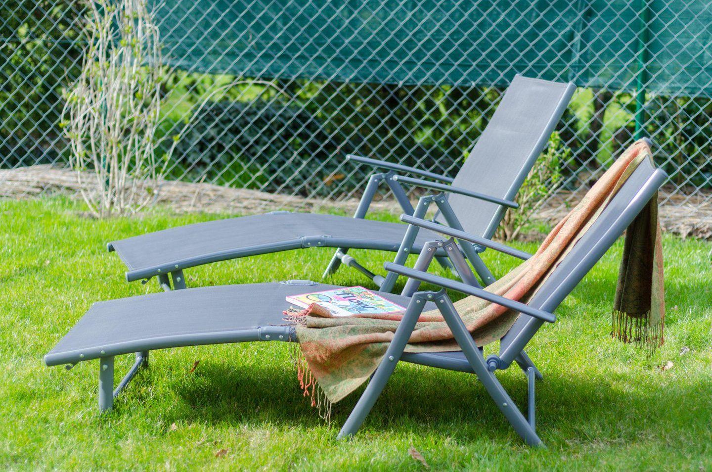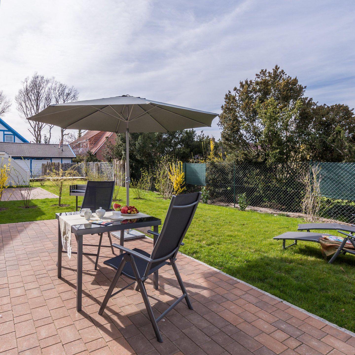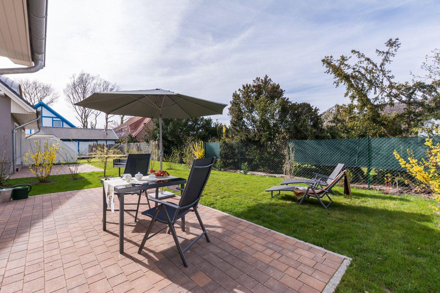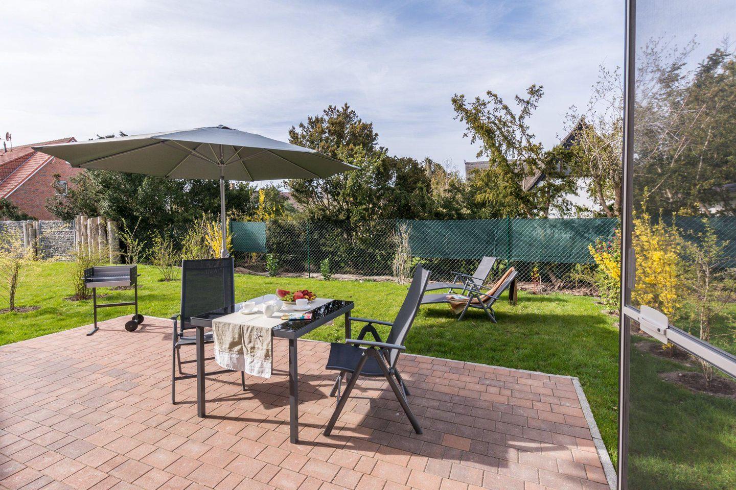 Im Garten stehen Gartenmöbel, ein Sonnenschirm und zwei Sonnenliegen zur Verfügung.