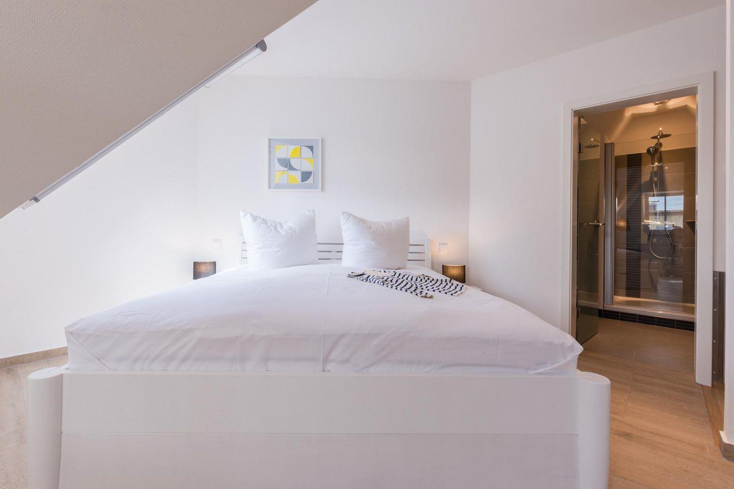 Im Obergeschoss finden Sie das gemütliche Schlafzimmer mit Doppelbett und TV und einer weiteren Schlafcouch als Aufbettung und Badezimmer mit Dusche/WC.