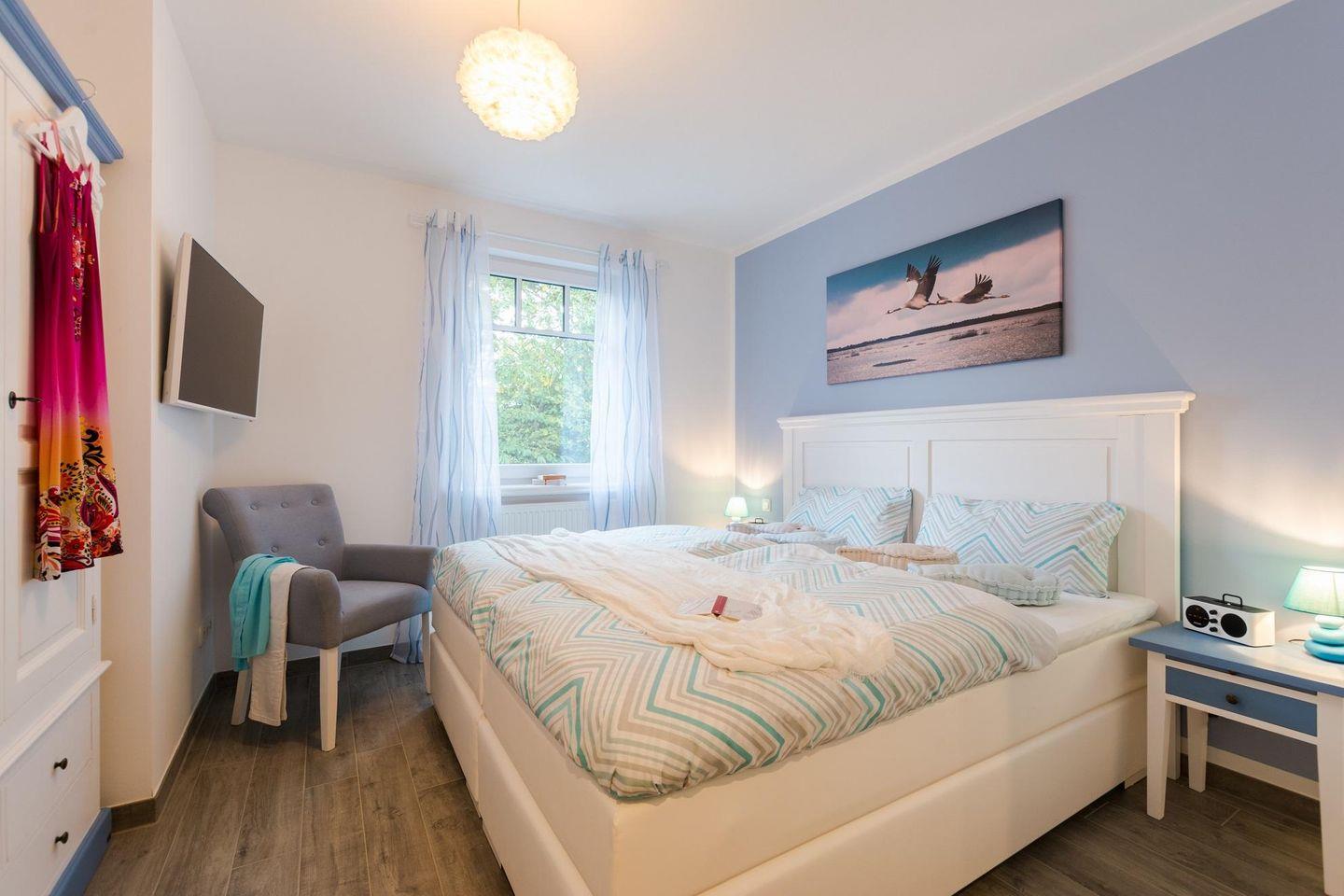Schöne 53m² Ferienwohnung mit Fahrstuhl, hochwertig und maritim eingerichtet für 2-4 Personen in der 1.Etage eines Mehrfamilienhauses, der Fahrstuhl hält in der 1 Etage und dann sind es nur noch 4 Stufen bis zur Wohnung, zentrale Lage im Ortskern, die Entfernung zum Bodden ist 600m, zum Strand sind es 500 m, Wohnzimmer mit kompletter Küchenzeile, hochwertige Schlafcouch , TV, WLAN-Internet inkl. Balkon, Insektenschutz, Schlafzimmer mit Ehebett und TV, Bad mit bodengleicher Dusche