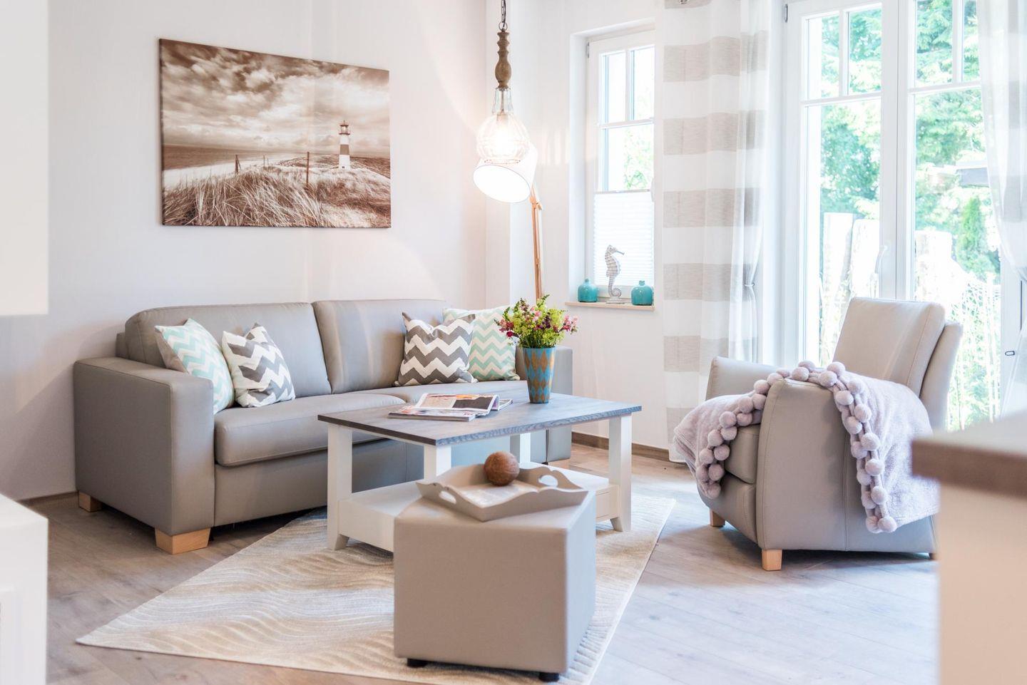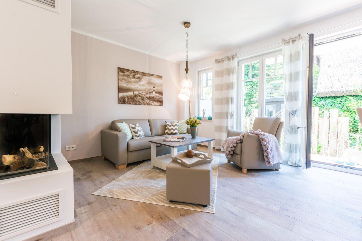 Modernes Traumreihenmittelhaus "Sonne und Meer" direkt hinter dem Deich in Zingst mit Terrasse und Gartenmöbeln.