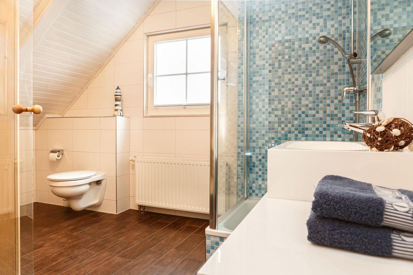 Gemütliche Ferienwohnung Muschelblau im Obergeschoss nahe Strand und Ortszentrum mit Sauna und Terrasse.