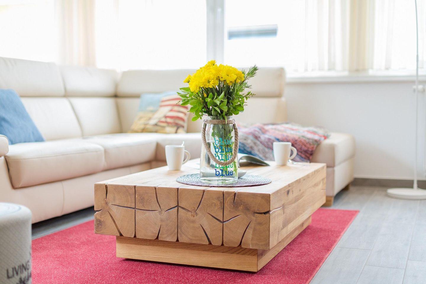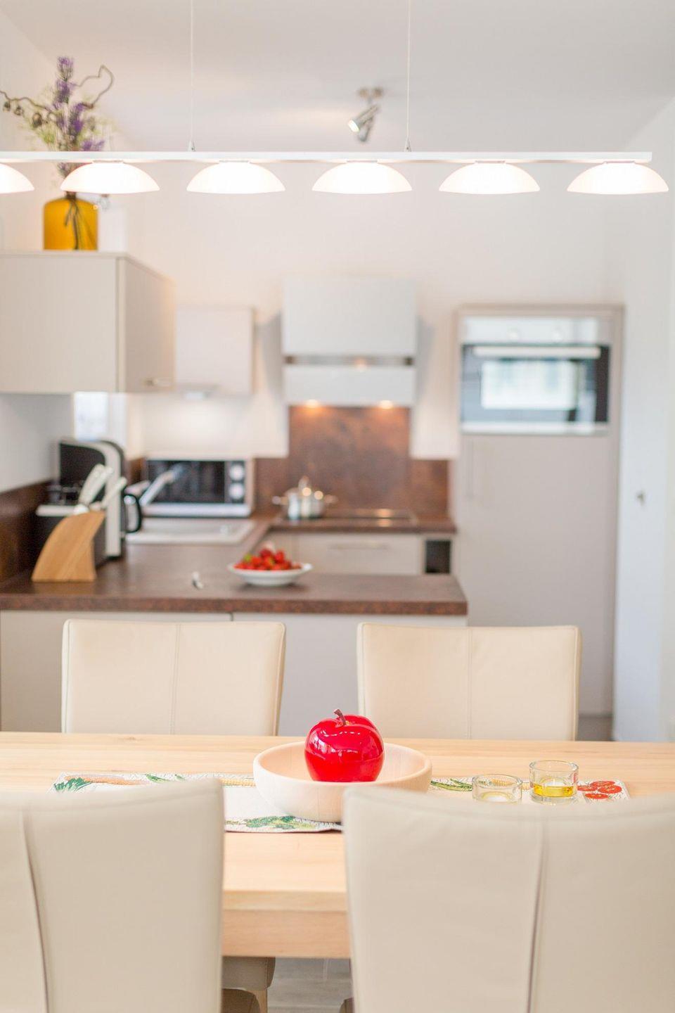 Ein großzügiger Wohnraum mit Wohn-/Essbereich mit LED-TV, W-LAN, Radio/CD und Kaminofen (Holz ist nicht inklusive) sowie einer kompletten Einbauküche lässt keine Wünsche offen.