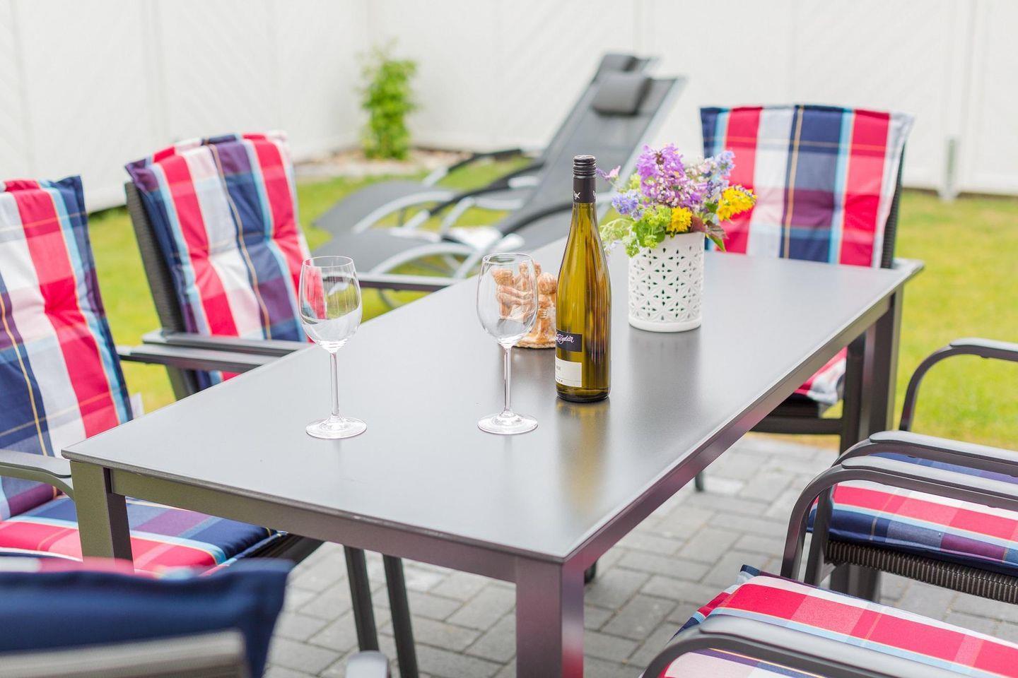 Eine schöne Terrasse mit Gartenmöbeln und 2 Sonnenliegen zum Entspannen finden Sie auf dem Grundstück. Es handelt sich um ein Nichtraucherhaus mit Waschmaschine, Hund ist erlaubt.