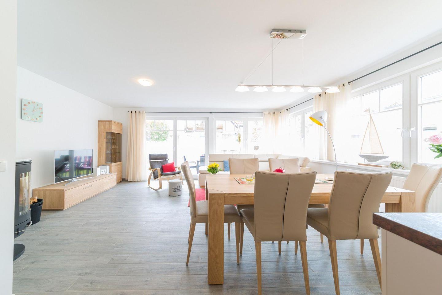 Ein großzügiger Wohnraum mit Wohn-/Essbereich mit LED-TV, W-LAN, Radio/CD und Kaminofen (Holz ist nicht inklusive) sowie einer kompletten Einbauküche lässt keine Wünsche offen. Alle 3 Schlafzimmer sind mit LED-TV ausgestattet, davon ein Schlafzimmer mit Doppelbett 1,80 x 2,00m, ein Schlafzimmer mit Doppelbett 1,40 x 2,00m (jeweils Boxspringbetten), sowie das Schlafzimmer im Dachspitz mit 2 Einzelbetten 0,90 x 2,00 m. Für ein Kleinstkind stehen Kinderreisebett und Hochstuhl bereit.