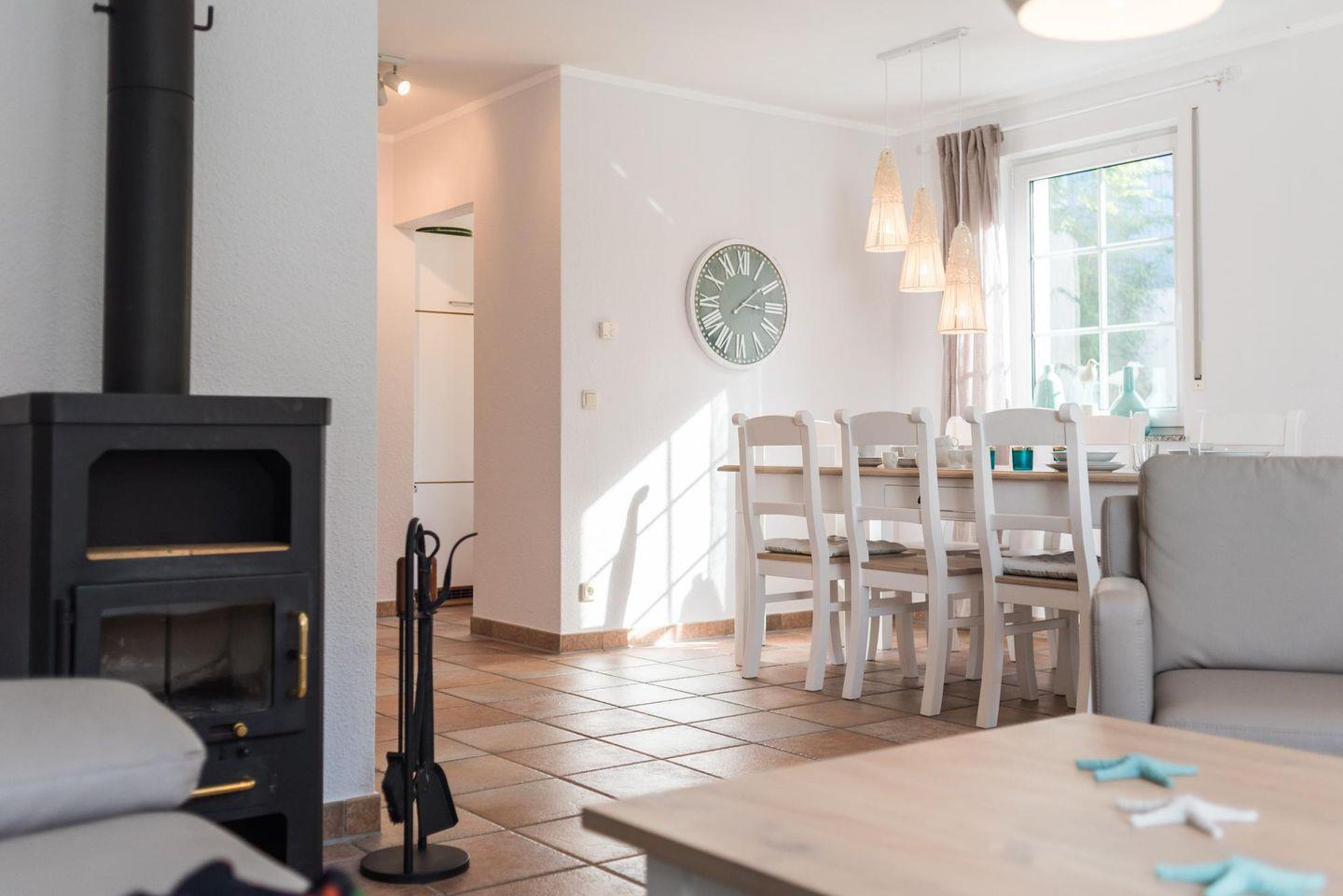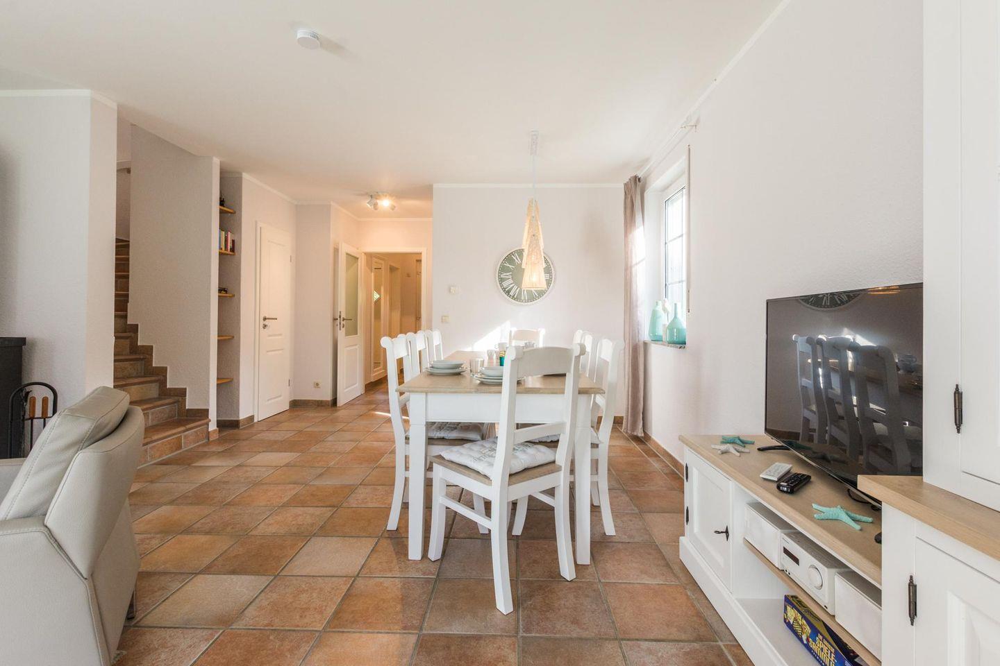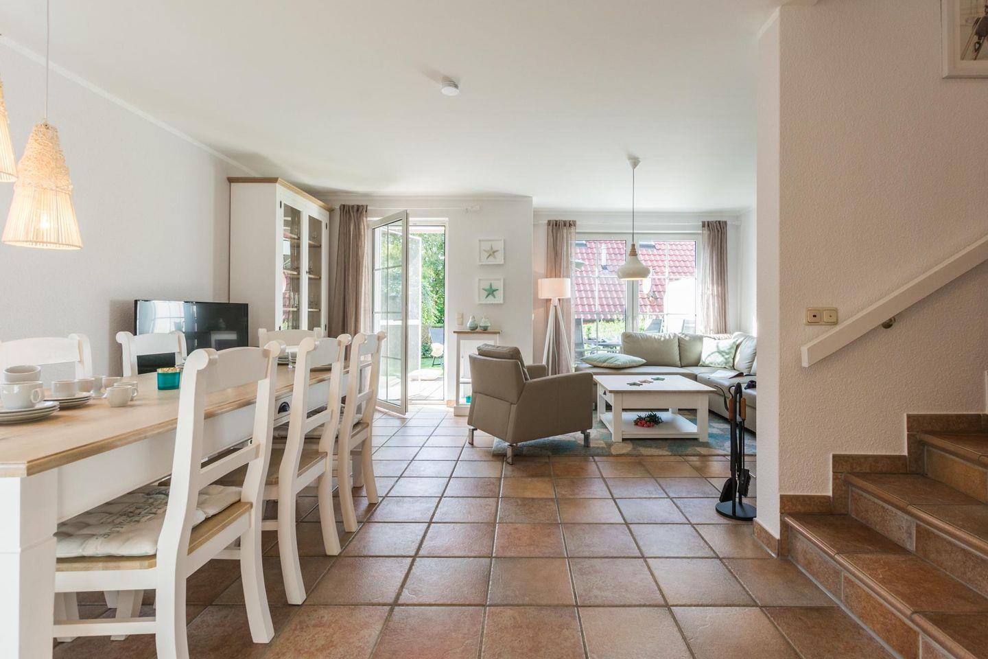 Die Haushälfte, ist ruhig und strandnah (200 m zum Ostseestrand) und zugleich zentrumsnah (800 m Zentrum) gelegen, eignet sich für 8 Personen und ein Kleinstkind. W-LAN inklusive. Ein großzügiger Wohnraum mit Wohn-/Essbereich, LED-TV, Hifi-Anlage und Kaminofen sowie einer kompletten Einbauküche. Im HWR steht eine Waschmaschine zu Verfügung. Es sind 4 Schlafzimmer vorhanden (2x Doppelbetten, 4xEinzelbetten ). 1x Dusche/WC und1x Dusche/Badewanne/WC und kostenfreie Sauna mit sep. Dusche.