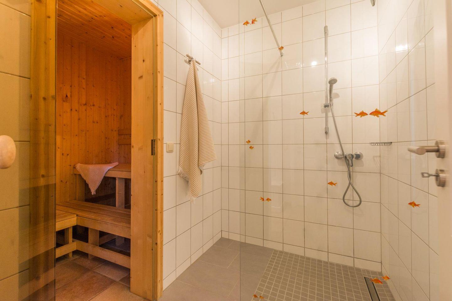 sowie das Dachgeschoss mit 2 Einzelbetten. 1x Dusche/WC und 1x Dusche/Badewanne/WC und kostenfreie Sauna mit sep. Dusche.
