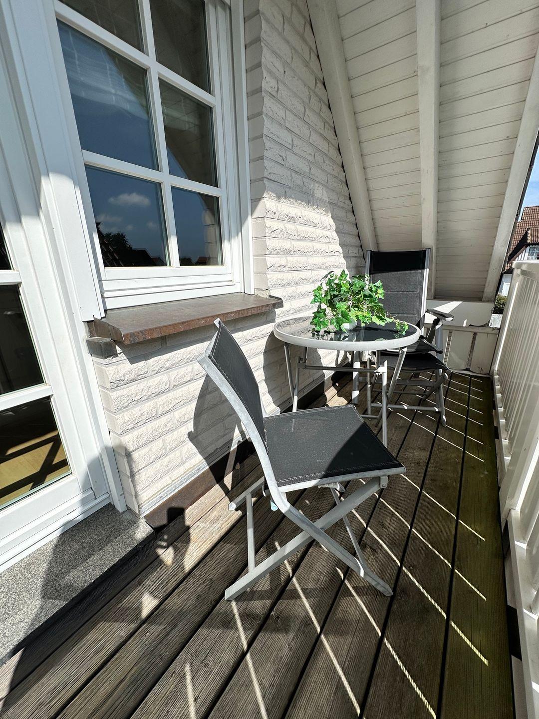 Die Wohnung verfügt über einen Balkon mit Gartenmöbeln.