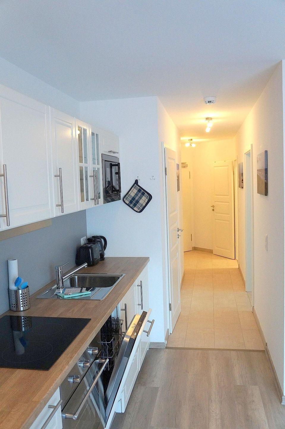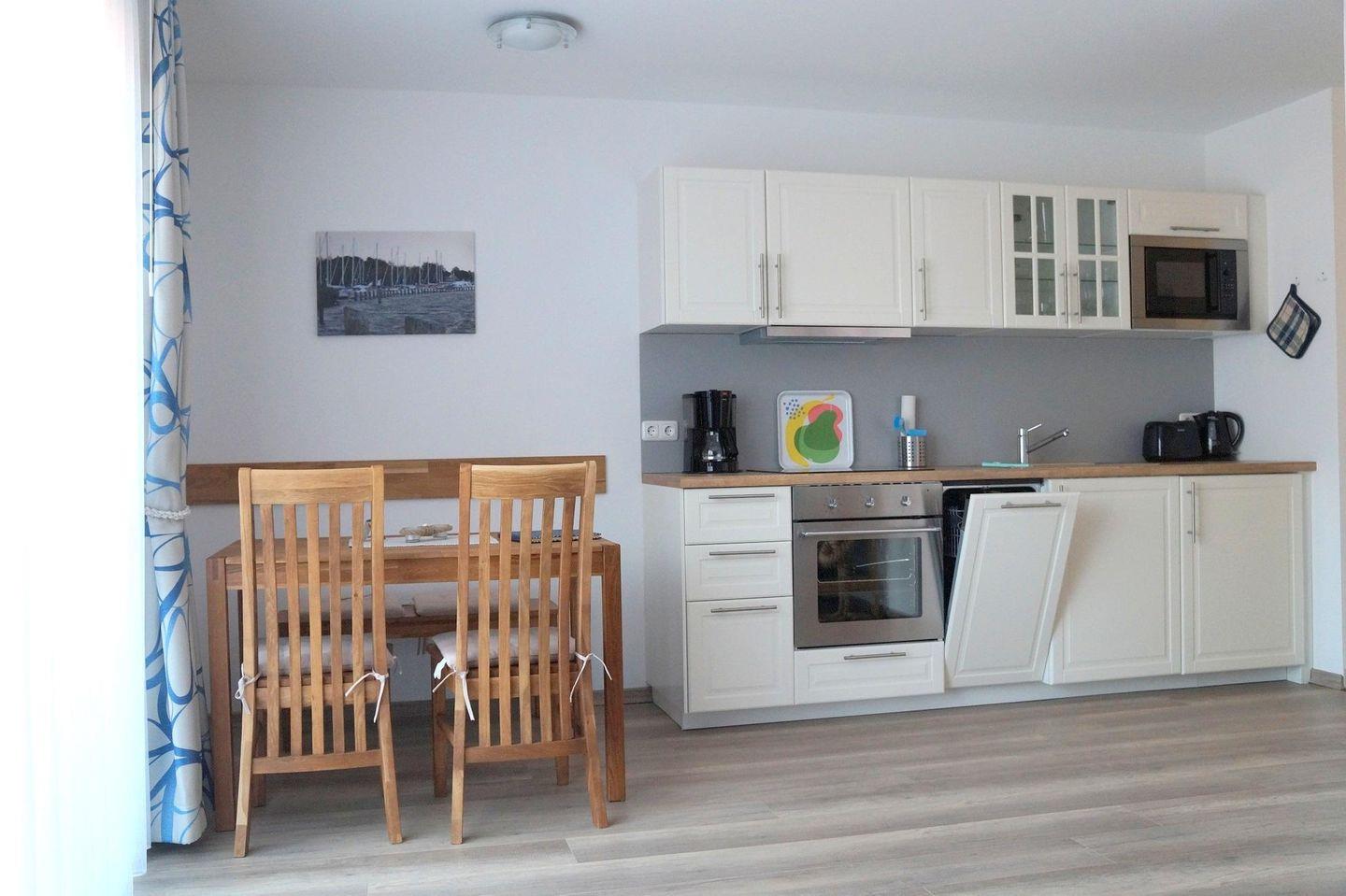 Die Wohnung verfügt über ein offenes Wohn- und Küchenkonzept. Eine voll ausgestattete Küche mit Ceranherd, Kühlschrank, Geschirrspüler, Backofen, Mikrowelle, Wasserkocher, Toaster und Kaffeemaschine lässt keine Wünsche offen.