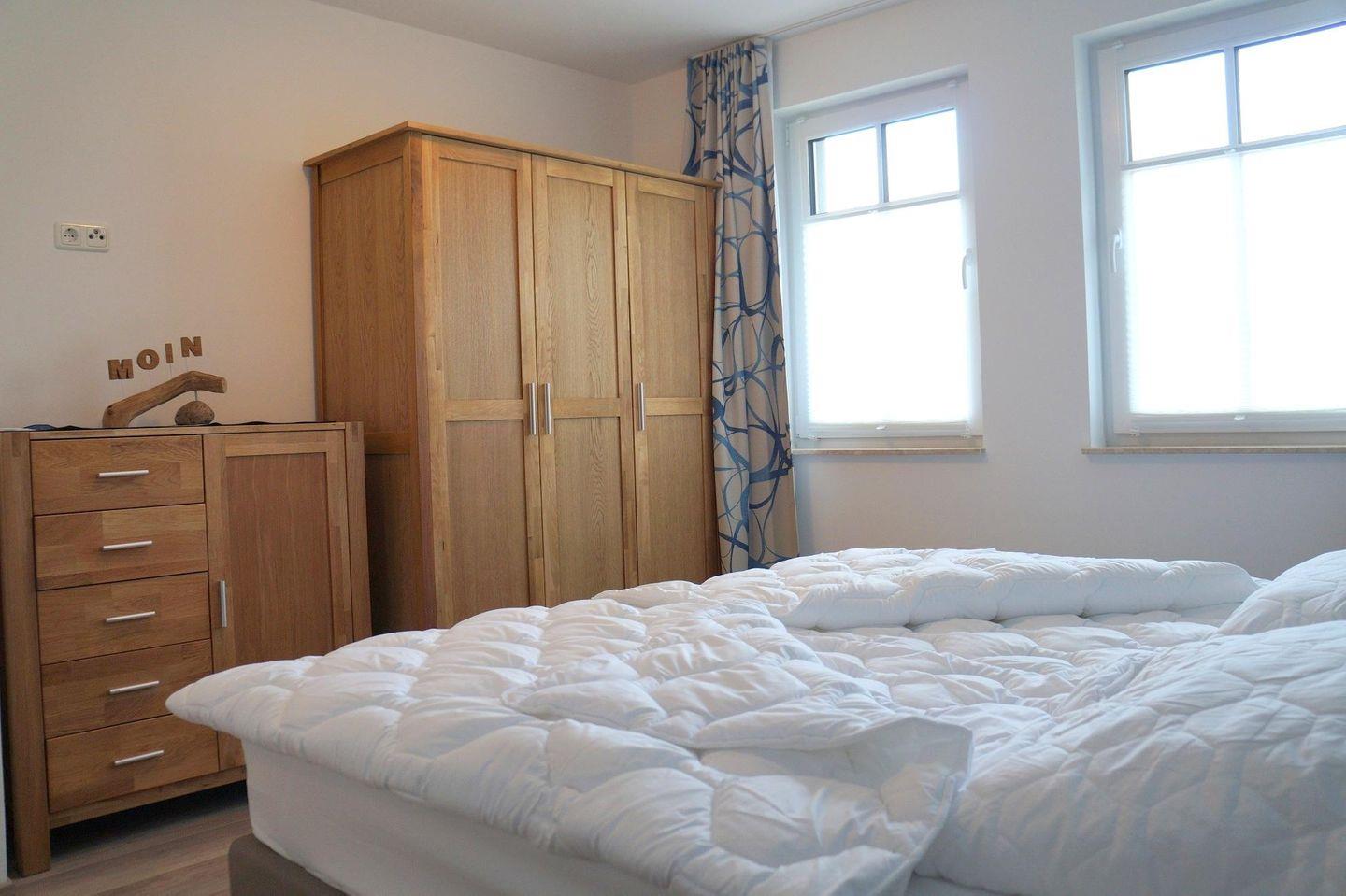 Das Schlafzimmer verfügt über ein Doppelbett und TV.