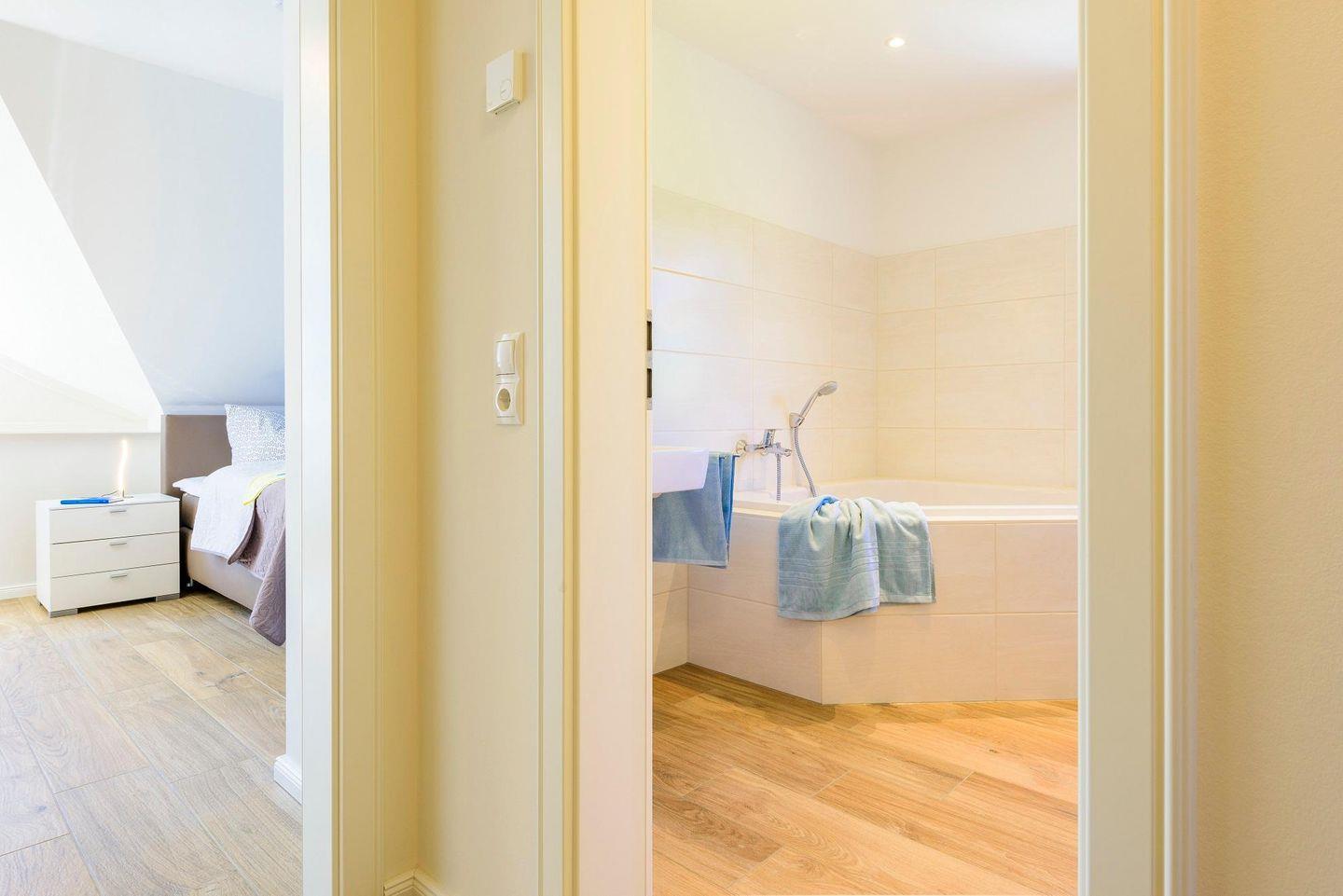 Beide Bäder haben eine Dusche, ein Bad verfügt zusätzlich über eine Badewanne. 1 Schlafzimmer mit festem Kinderbett.