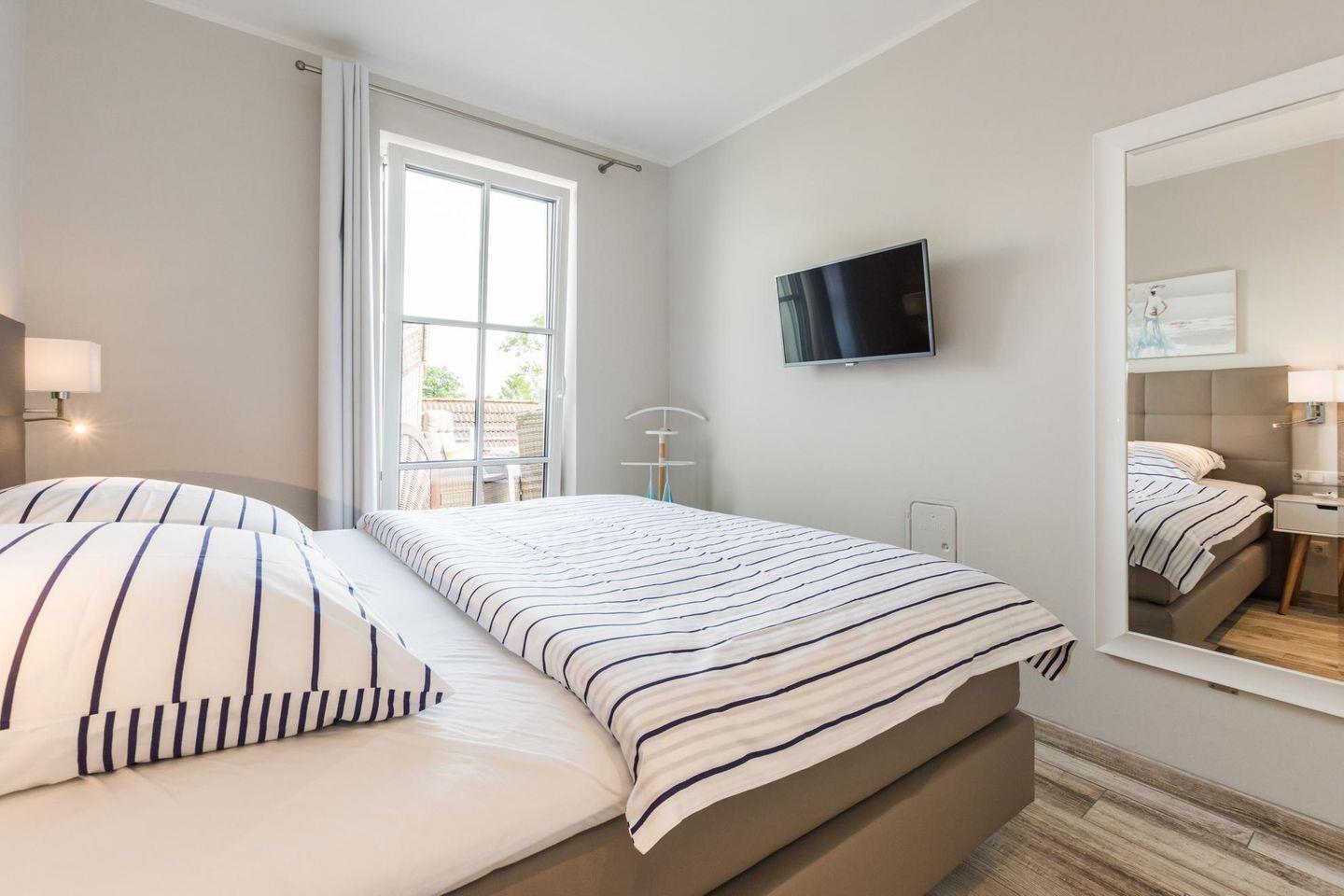 Im Schlafzimmer befindet sich ein Boxspringbett (1,80 x 2,00 m mit durchgängiger Matratze), ein großer Kleiderschrank mit Safe und ein LED-TV.