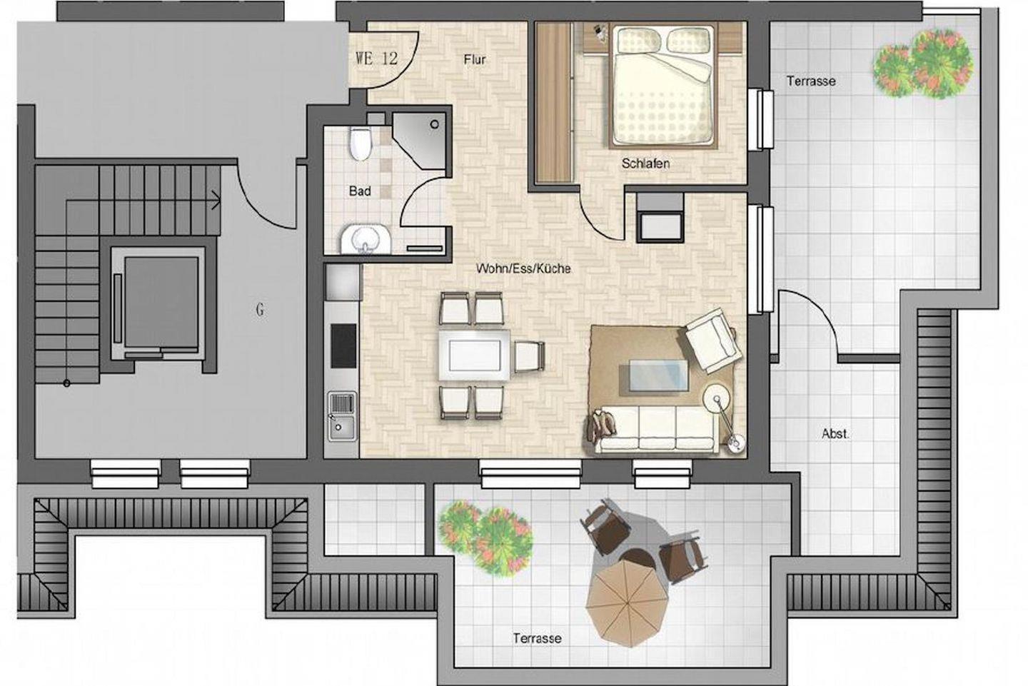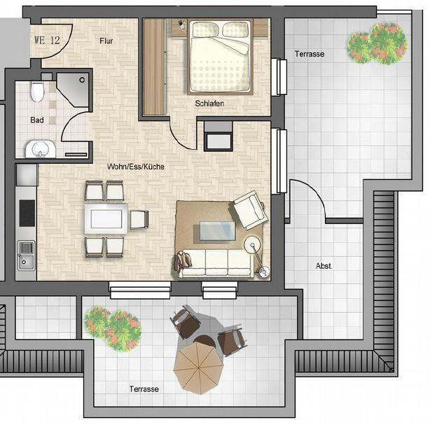 Sie verfügt über rund 55 m² Wohnfläche und zwei große Dachterrassen, die nach Süden und Westen ausgerichtet sind.