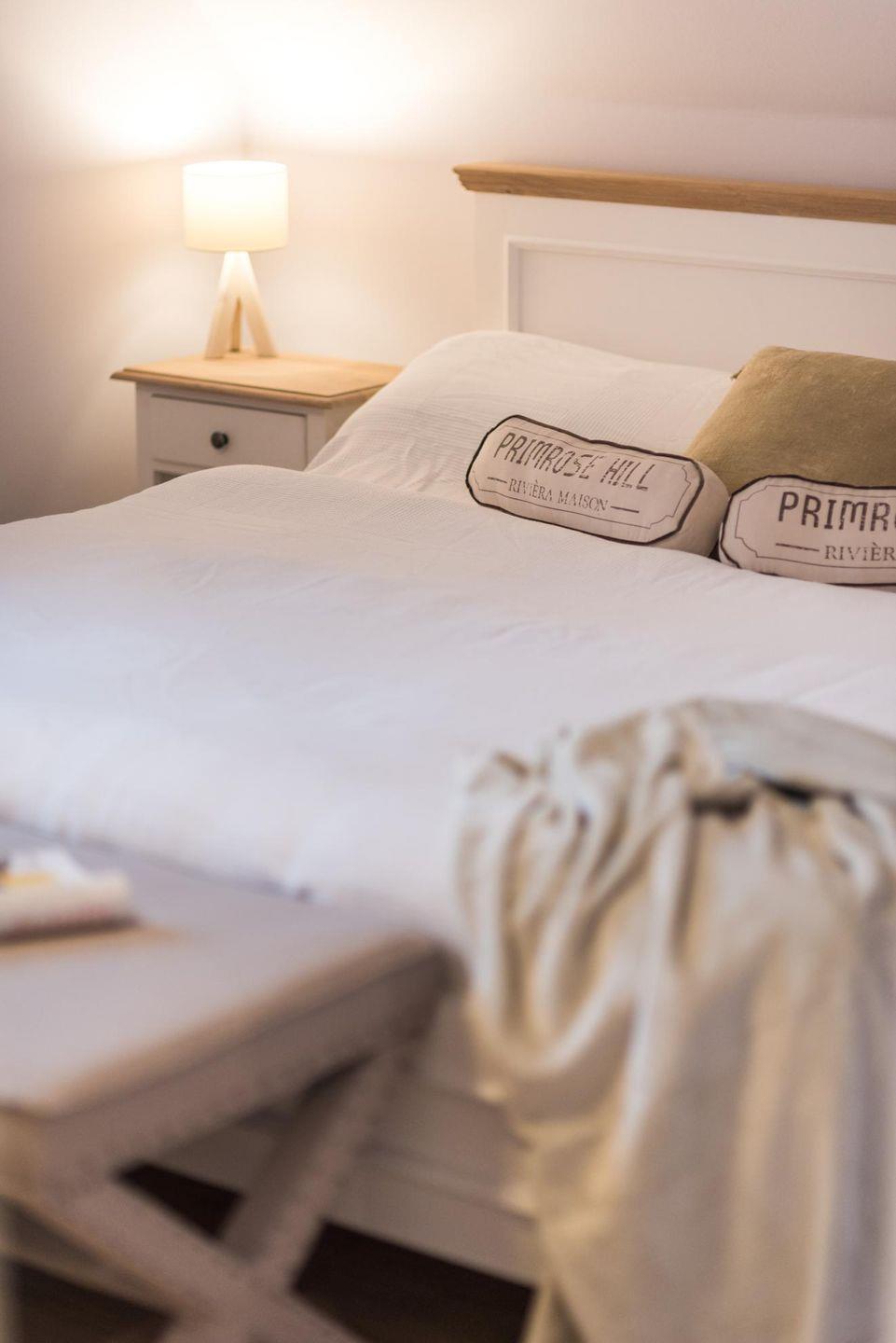 Zwei Schlafzimmer sind mit Doppelbetten und ein Schlafzimmer mit zwei Einzelbetten ausgestattet. Für ein Kleinstkind stehen Kinderreisebett, Hochstuhl. Beide Bäder haben eine Dusche.