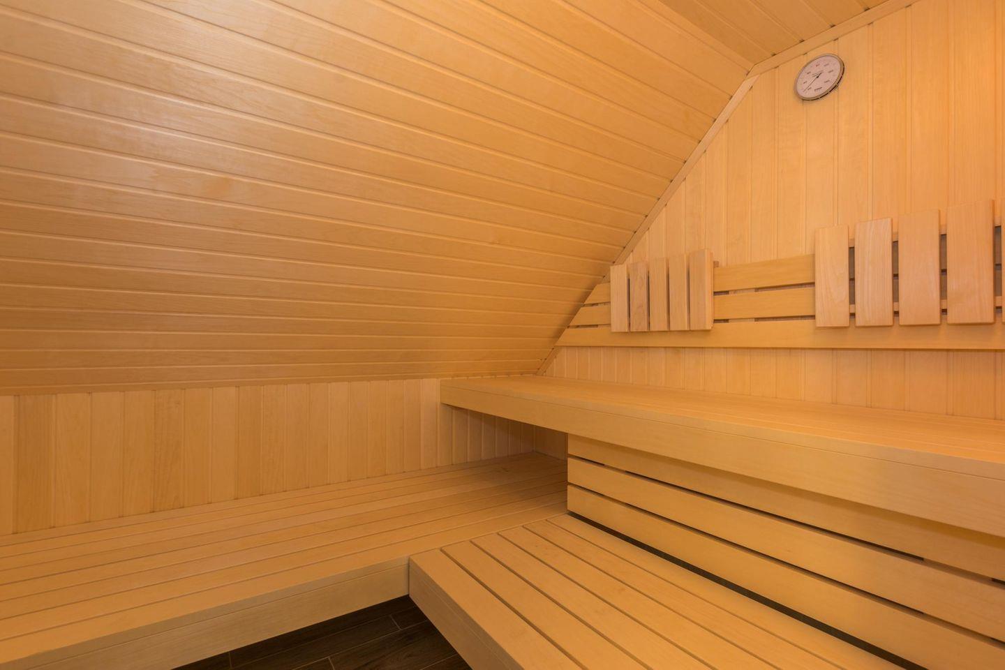 Im Obergeschoß befinden sich 1 Schlafzimmer mit Doppelbett und 1 Schlafzimmer mit 2 Einzelbetten sowie ein Bad mit Dusche/ WC und die Sauna.