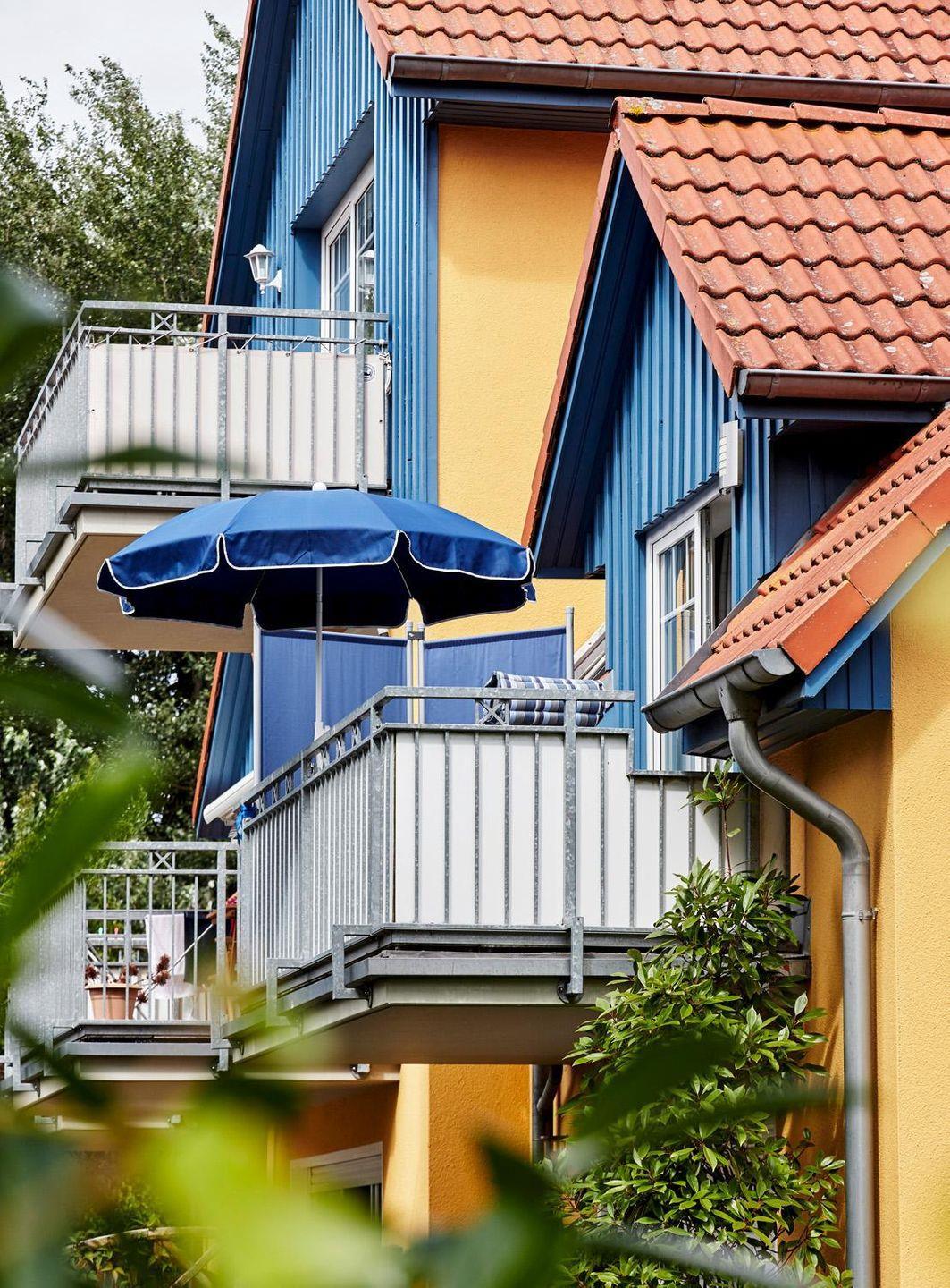 Es gibt einen Westbalkon mit Sonnenschirm und Balkonmöbel