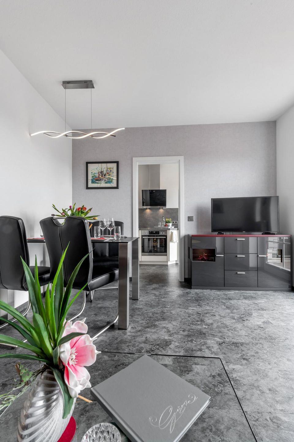 Die Ferienwohnung verfügt über 1 Wohnzimmer und 1 Schlafzimmer mit Doppelbett, separate und voll ausgestattete Küche mit Geschirrspüler, 1 Bad mit bodengleicher Dusche.