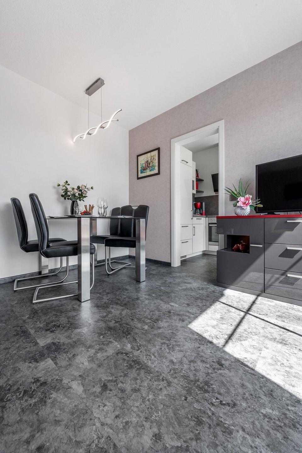 Die großzügige und geschmackvoll eingerichtete Ferienwohnung verfügt über ein gemütliches Schlafzimmer, in dem Sie nach erlebnisreichen Tagen zur Ruhe kommen können. Der Wohnbereich ist modern und einladend, ausgestattet mit einem Fernseher, der für entspanntes Entertainment sorgt. Hier können Sie gemütliche Abende verbringen oder einfach die Ruhe genießen. Außerdem steht Ihnen eine voll ausgestattete, geschlossene Küche zur Verfügung, die mit einem Herd, Backofen, Kühlschrank, Gefrierfach, Spülmaschine, Wasserkocher, Toaster und einer Kaffeemaschine auch kulinarische Genüsse erlaubt. Ob Frühstück auf der Terrasse oder ein gemeinsames Abendessen – hier können Sie nach Herzenslust selbst kochen.