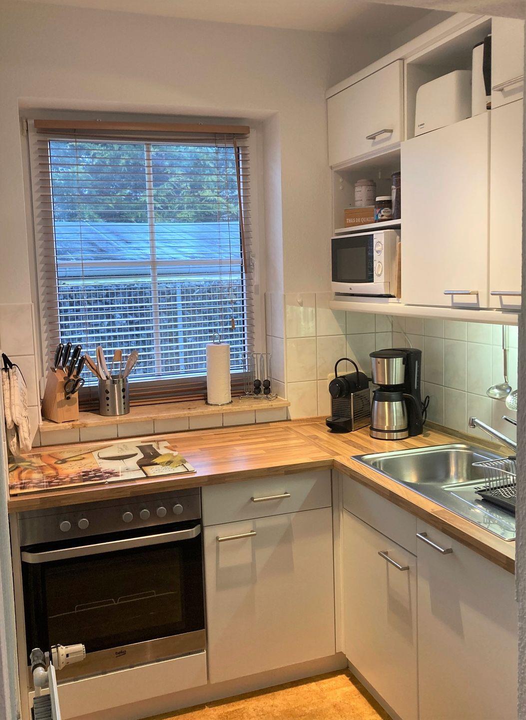Ein gemütliches Wohnzimmer mit einem geräumigen Esstisch, ein großer Flachbild TV (Smart-TV geeignet) mit DVD-Player, eine kleine hochwertig ausgestattete Küche mit Mikrowelle und Nespresso Maschine, Kühlschrank mit Gefrierfach, Ceranfeld und Einbaubackofen, sowie ein Airfryer, ein helles modernes Badezimmer mit großer Dusche, ein Schlafzimmer mit Doppelbett und einem sehr großen Einbauschrank.