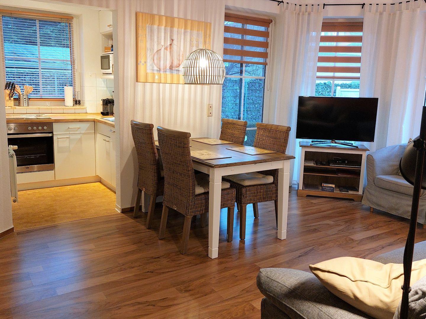 Ein gemütliches Wohnzimmer mit einem geräumigen Esstisch, ein großer Flachbild TV mit DVD-Player, eine kleine hochwertig ausgestattete Küche mit Mikrowelle und Nespresso Maschine, Kühlschrank mit Gefrierfach, Ceranfeld und Einbaubackofen, ein helles modernes Badezimmer mit großer Dusche, ein Schlafzimmer mit Doppelbett und einem großen Einbauschrank. Ein weiteres nach Norden ausgerichtetes Zimmer kann als Schlafzimmer genutzt werden. Hier steht Ihnen ein ausziehbares Doppelbett zur Verfügung.