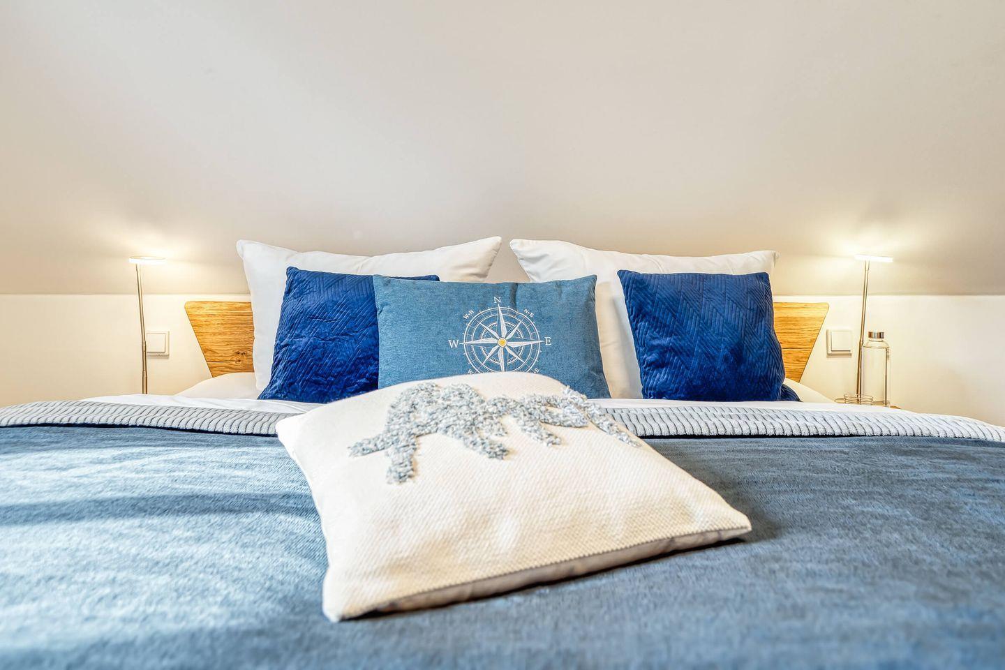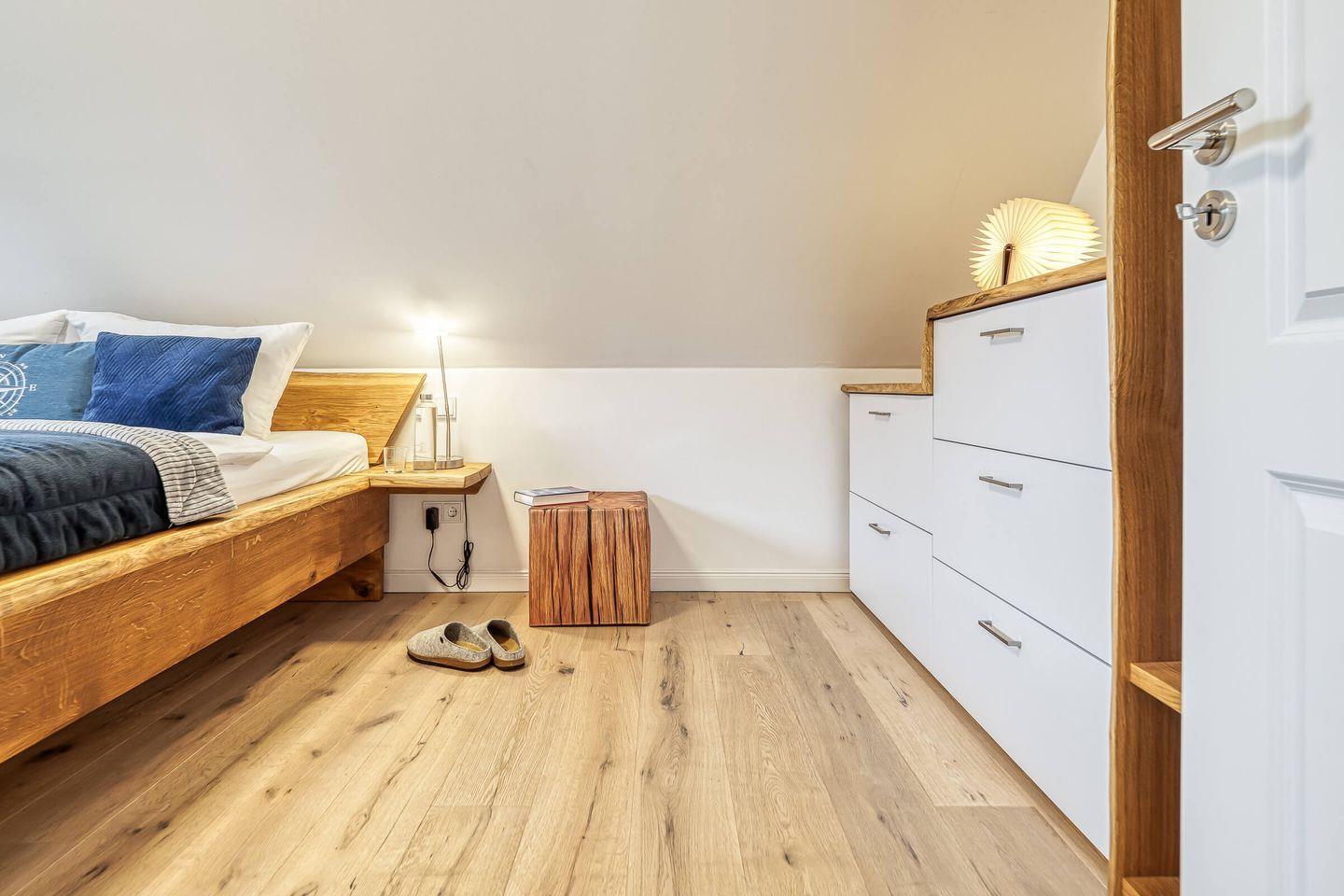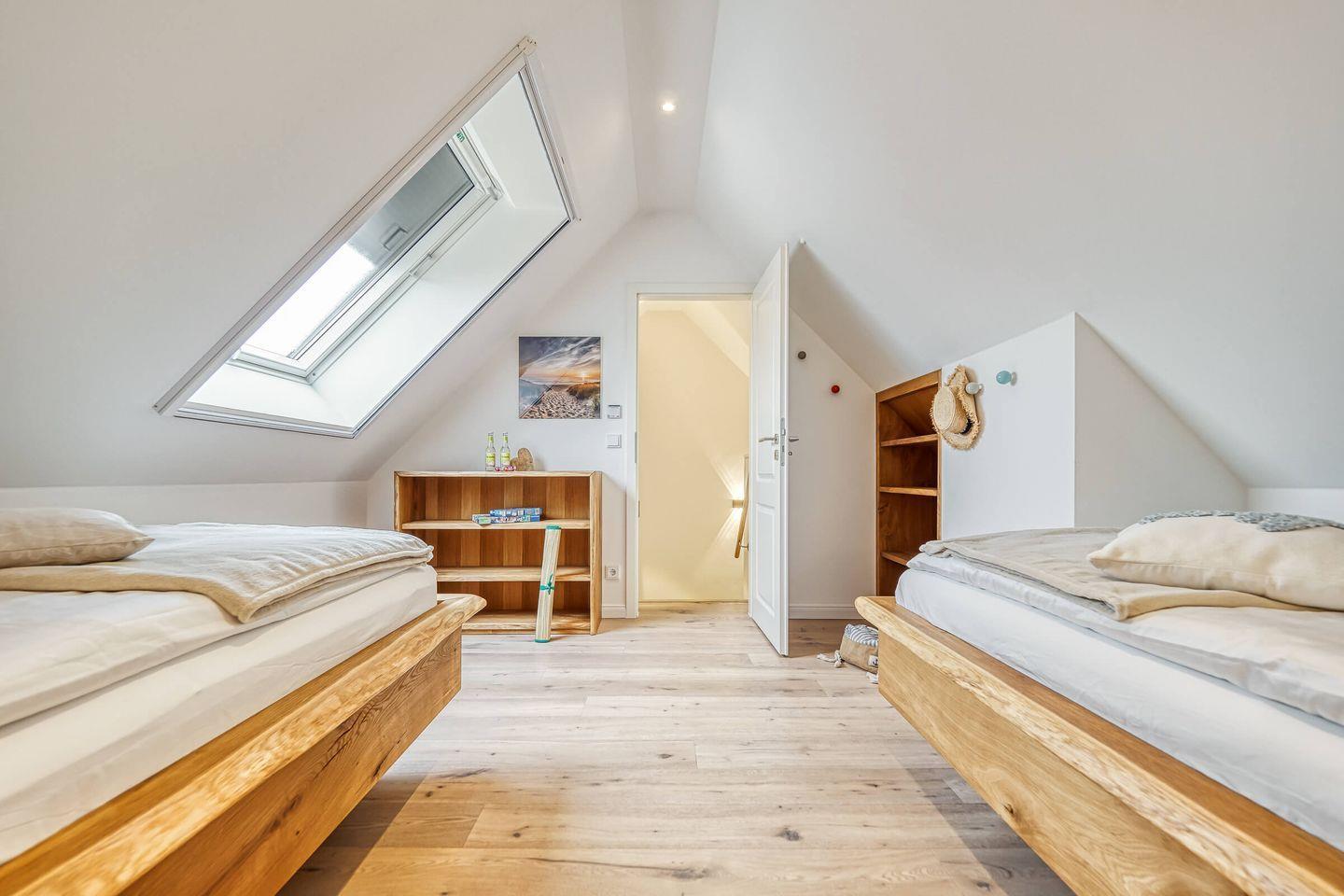 In einem Schlafzimmer befindet sich ein Doppelbett. Das zweite Schlafzimmer, welches sich im Spitzboden befindet und über eine innenliegende Treppe erreicht wird, ist mit zwei Einzelbetten ausgestattet.