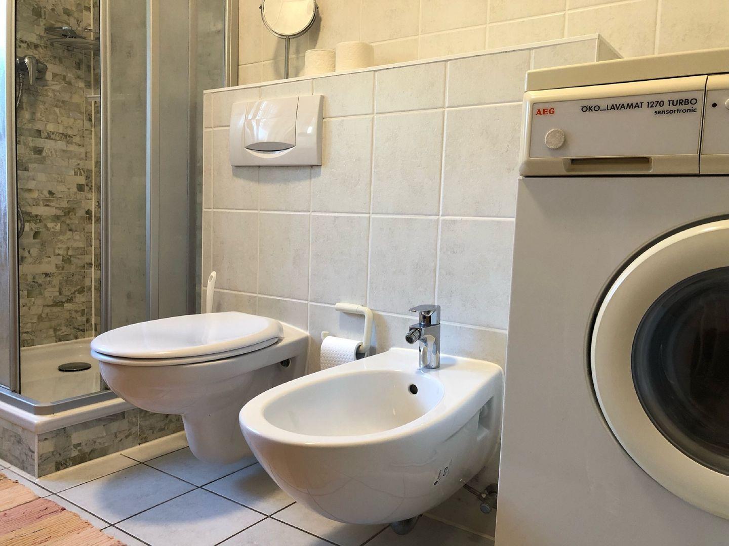 Es gibt ein Schlafzimmer mit Doppelbett und Babybett und ein Kinderzimmer mit Doppelbettliege (ca. 1,60 m breit). Das Bad hat eine Dusche, ein Bidet, Waschmaschine mit Trockner,