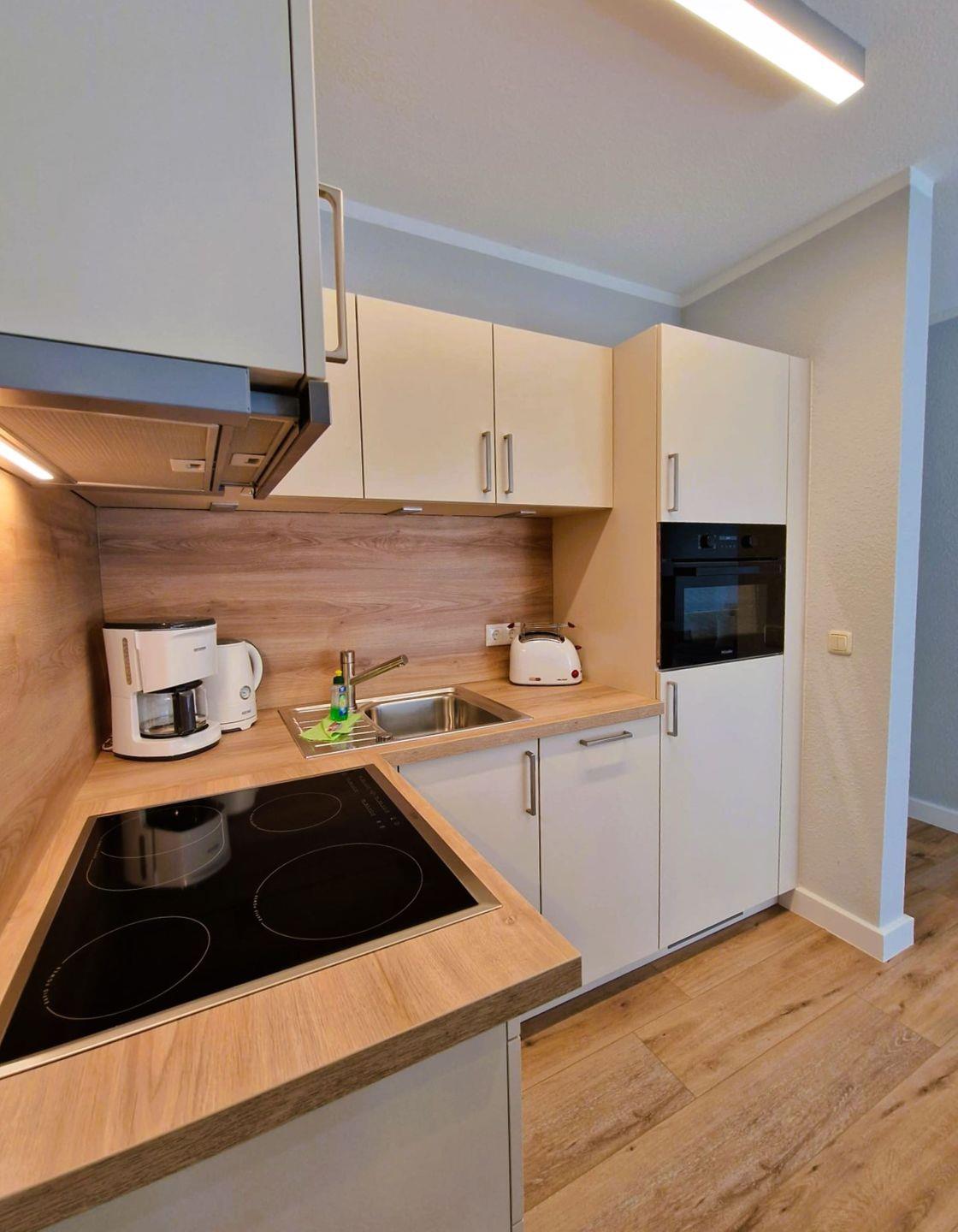 die offene Küchenzeile ist mit Spülmaschine, Mikrowelle und E-Herd ausgestattet, ohne Backofen.