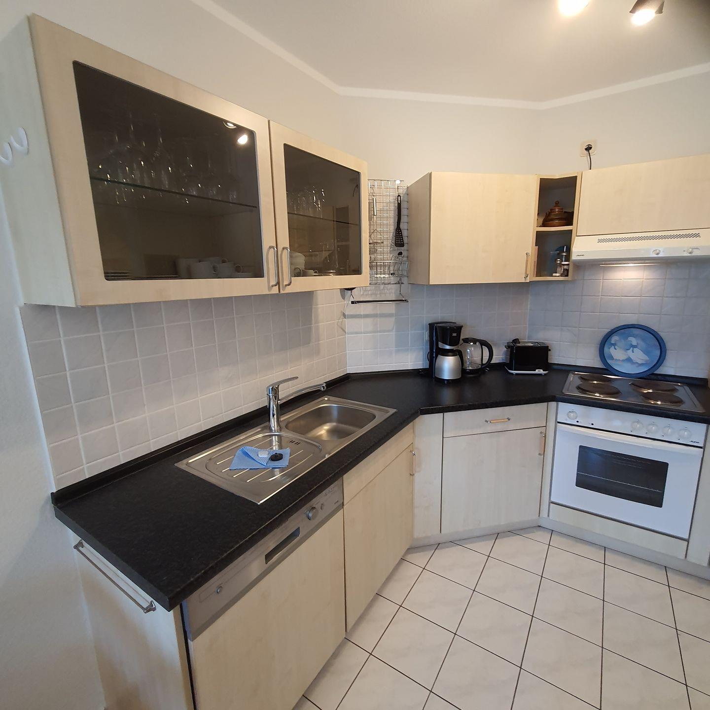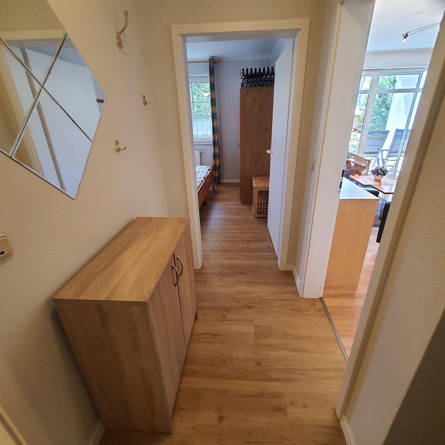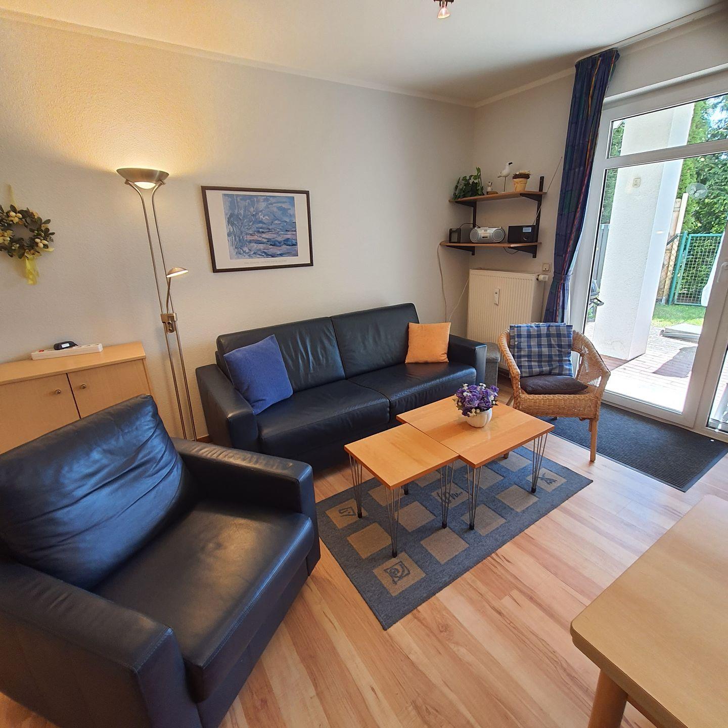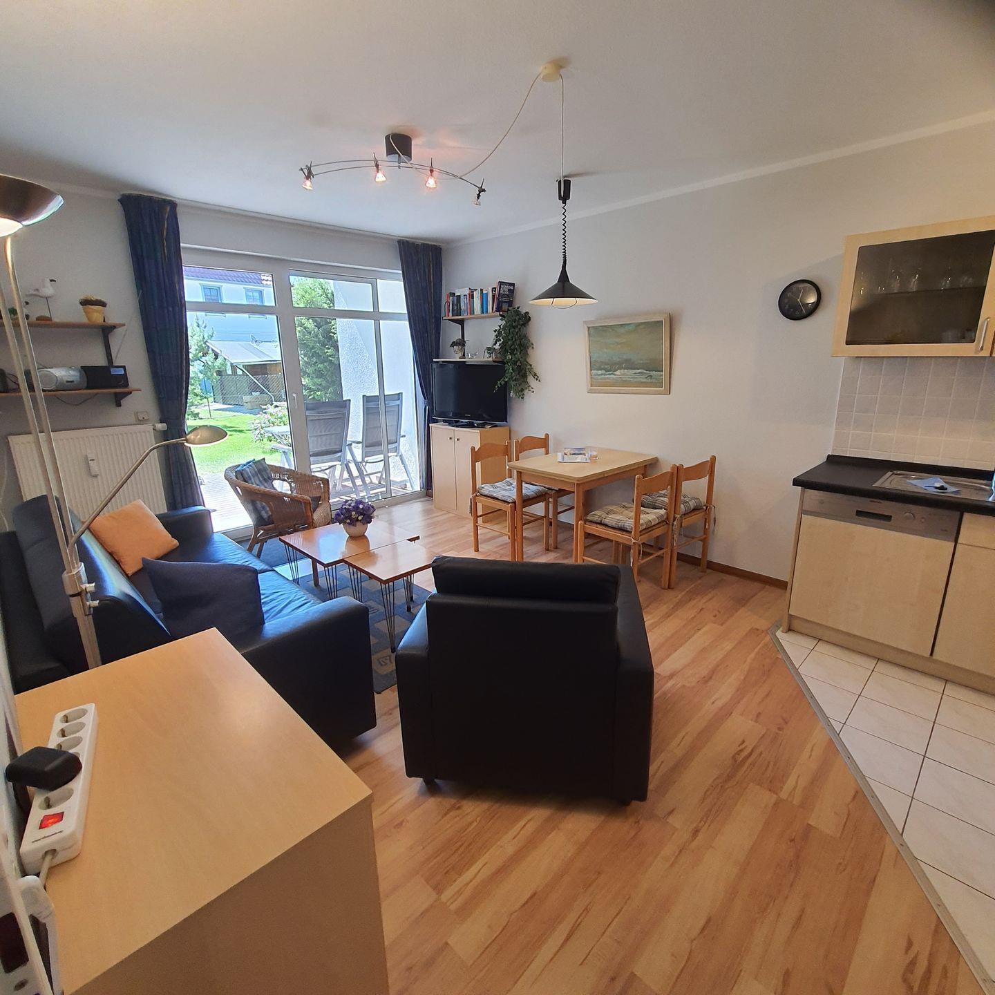 kleine Ferienwohnung im Appartementhaus, ca.46 m² groß,Terrasse mit Gartenmöbeln, zentral gelegen, bis zum Strand sind es ca. 700 m, EG, zur Wohnung gehört ein PKW-Stellplatz mit der Nr.2, ein Fahrradraum ist vorhanden, Wohnzimmer mit Schlaf- couch, Küchenzeile (Geschirrspüler), Dusche/WC, Schlafzimmer mit Doppelbett, Farb-TV, Bettwäsche und Handtücher bitte mitbringen