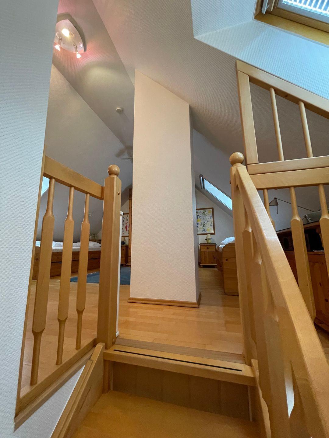 Obergeschoß: offenes Schlafzimmer mit getrennten Betten, Dusche/WC